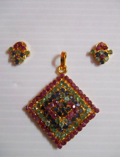 58.10 CTW GOLD PLATED EMERALD/SAPPIRE/RUBY PENDANT AND **|**|** 58.10 CTW GOLD PLATED EMERALD/SAPPIRE/RUBY PENDANT AND EARRING SET STERLING SILVER ; MSRP: $600