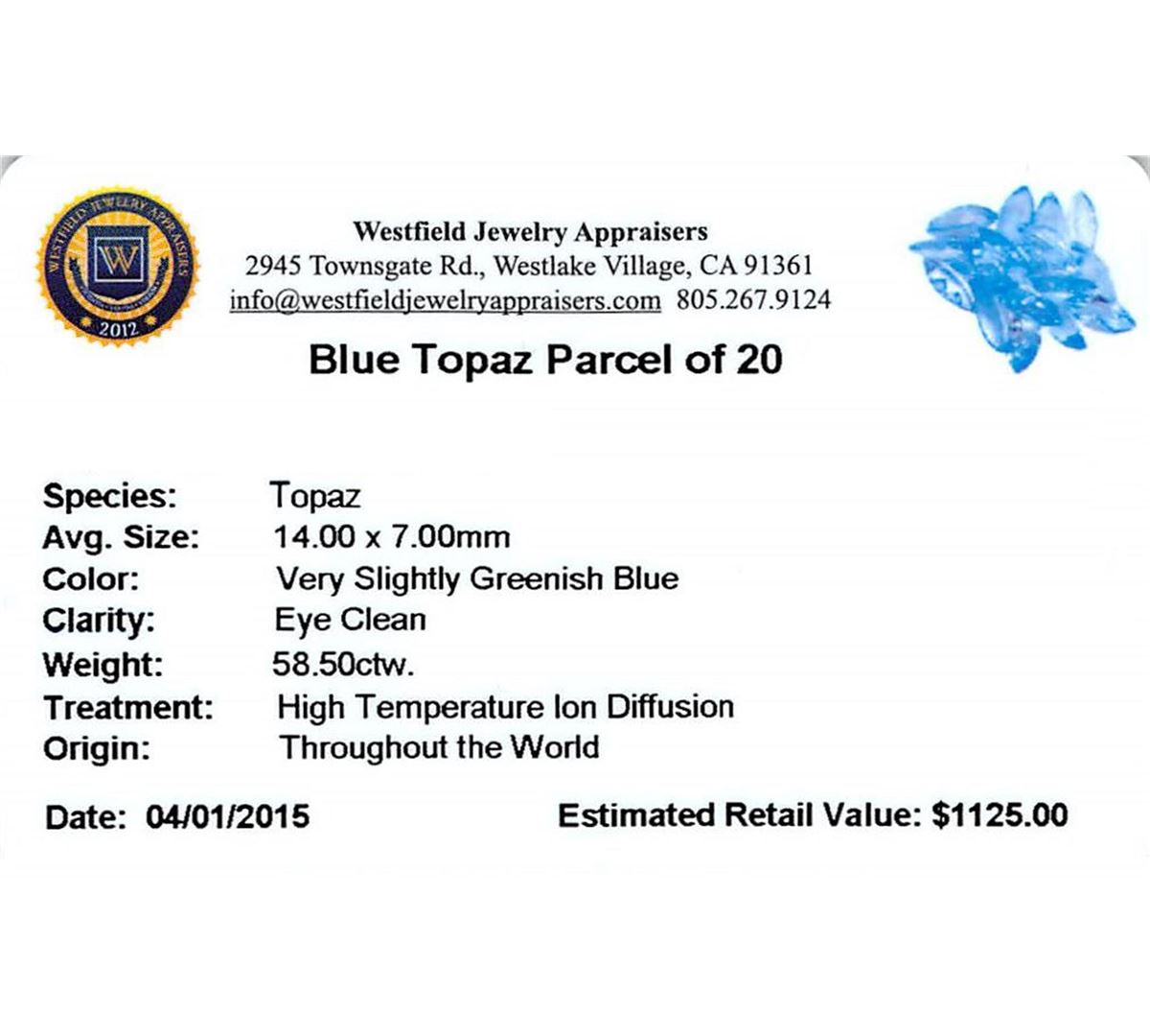Twenty marquise mixed cut natural blue topazs exact total weight 58.50ct., clarity is eye clean, type I, medium dark, moderately strong, very slightly greenish blue color, (GIA vslgB 6/4), cut is good. Westfield Appraised at $1,125.00.