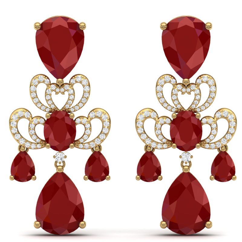 58.73 CTW Royalty Designer Ruby & VS Diamond Earrings 18K Yellow Gold ---- Luxury Designer Brand Earring Appraised Retail Price at $56,000 ---- SKU Number US38675 18K Yellow gold Earring Size is 54 Millimeter long, Earring measuring approx. 2 1/2 x 1 Inches, weighing in total approx. 23 grams. Made in the USA and is stamped 18K, Main stone 42.84 carat total weight containing 4 pieces of Intense Mid-Opaque Red color with AAA quality Pear shape cut Ruby , Stone #2 14 carat total weight containing 6 pieces of Intense Mid-Opaque Red color with AAA quality Pear , Oval shape cut