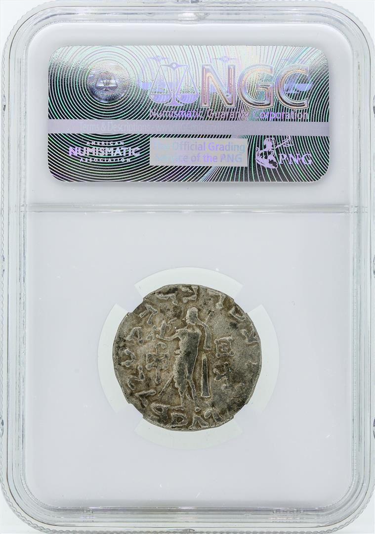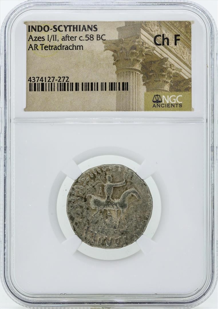 One 58 BC Indo Scythians Azes I/II AR Tetradrachm Coin NGC Ch F. NGC Certified.