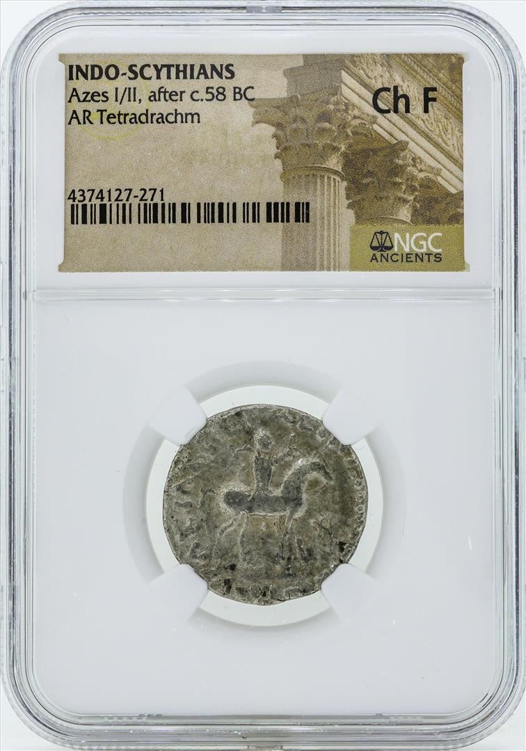 One 58 BC Indo Scythians Azes I/II AR Tetradrachm Coin NGC Ch F. NGC Certified.