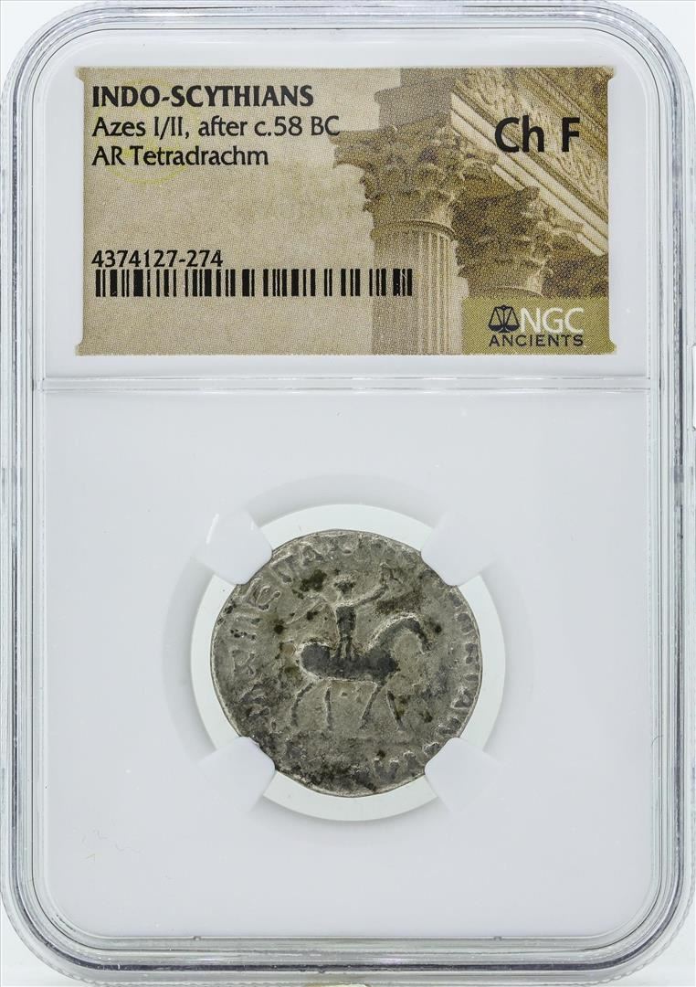 One 58 BC Indo Scythians Azes I/II AR Tetradrachm Coin NGC Ch F. NGC Certified.