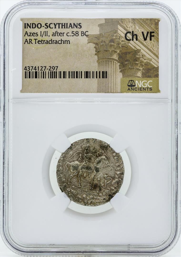 One 58 BC Indo Scythians Azes I/II AR Tetradrachm Coin NGC Ch VF. NGC Certified.