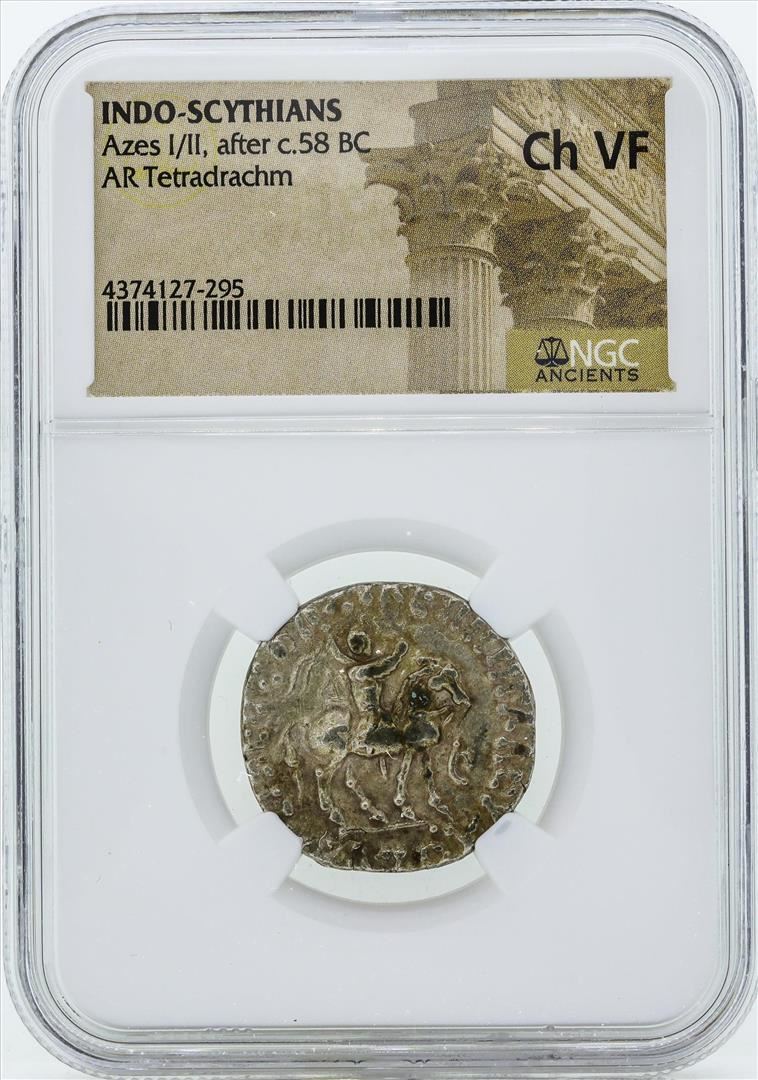 One 58 BC Indo Scythians Azes I/II AR Tetradrachm Coin NGC Ch VF. NGC Certified.