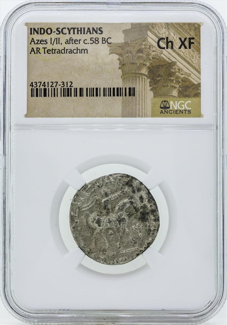 One 58 BC Indo Scythians Azes I/II AR Tetradrachm Coin NGC Ch XF. NGC Certified.