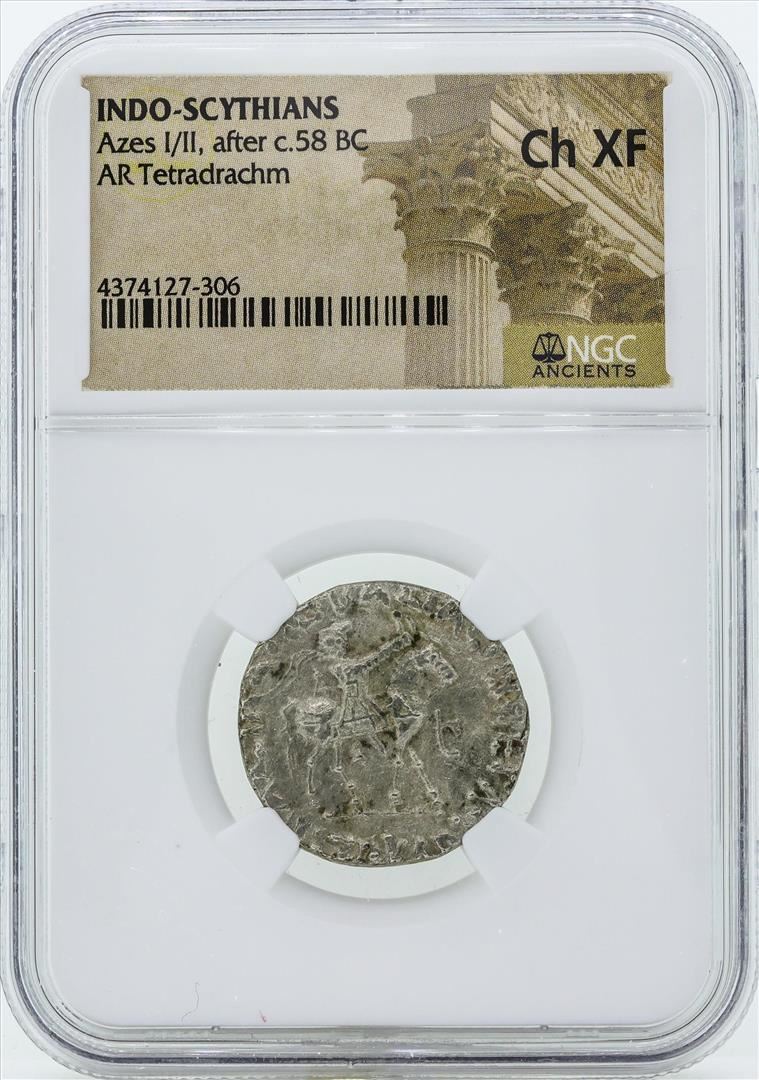 One 58 BC Indo Scythians Azes I/II AR Tetradrachm Coin NGC Ch XF. NGC Certified.