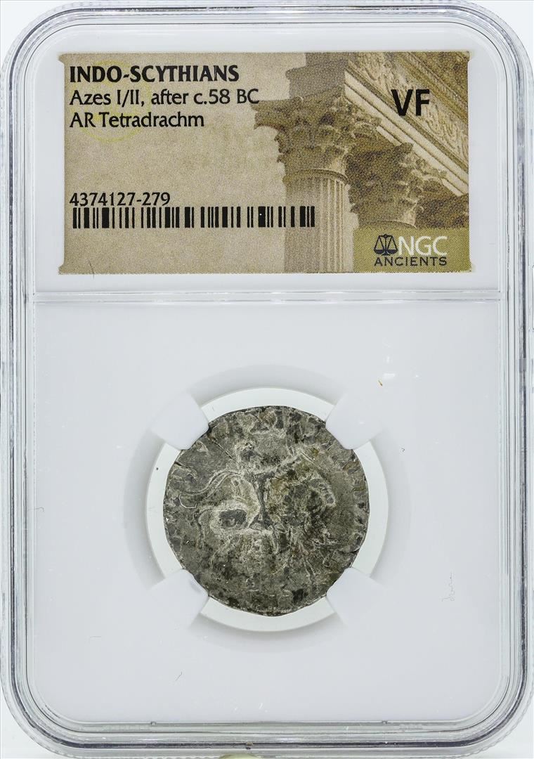 One 58 BC Indo Scythians Azes I/II AR Tetradrachm Coin NGC VF. NGC Certified.