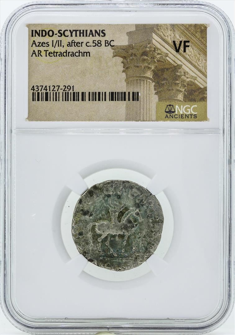 One 58 BC Indo Scythians Azes I/II AR Tetradrachm Coin NGC VF. NGC Certified.