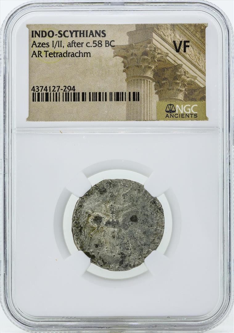 One 58 BC Indo Scythians Azes I/II AR Tetradrachm Coin NGC VF. NGC Certified.