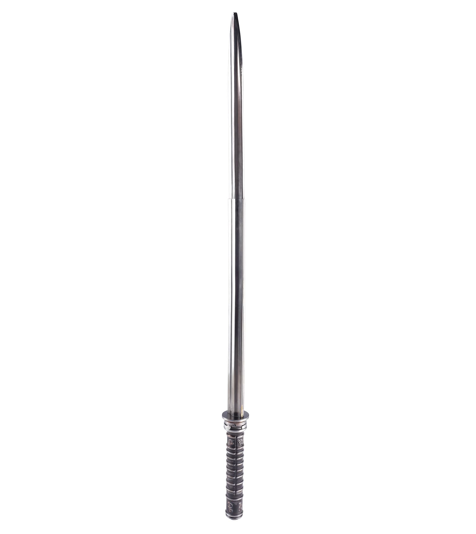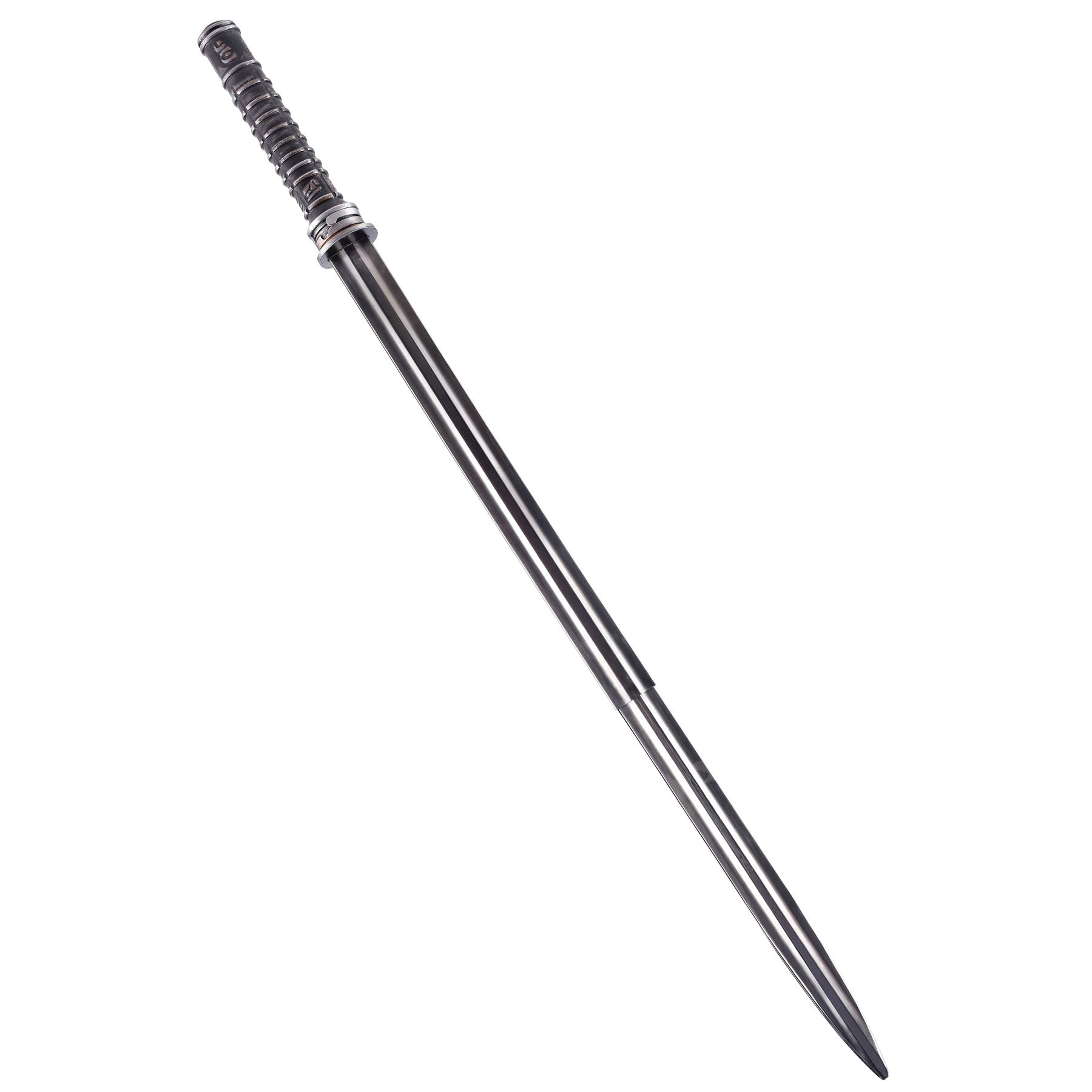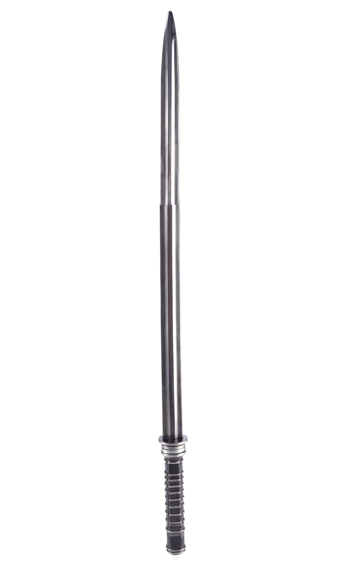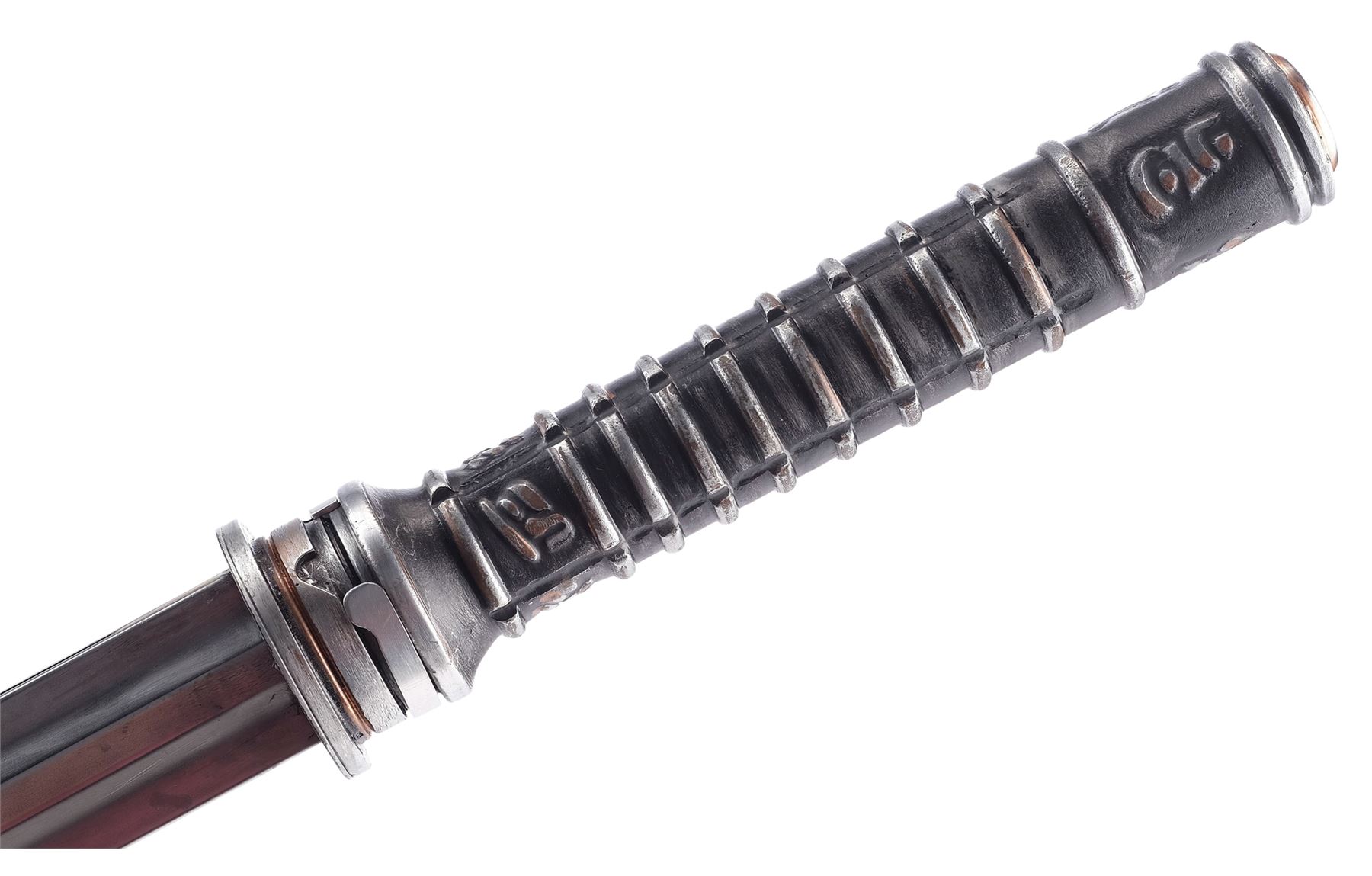 This aluminum version of the Daywalker's sword was created for SFX inserts of Blade stabbing other vampires. It features a polished blade with a retractable tip and a distinctive blood groove as well as a ribbed, less detailed version of the sword's signature grip painted black to appear wrapped with leather. The retractable tip exhibits scuffing at its point and the paint on the grip exhibits flaking from production use and handling. Dimensions: 36" x 2" x 2" (91.5 cm x 5 cm x 5 cm)