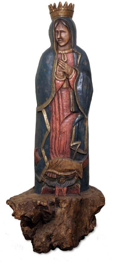 Virgin Madonna Carving. 58" x 30" x 30". hand carved & painted wood figure of Our Lady of Guadalupe. Circa 1920. (est $2,000-3,000). Additional Info: Collected in Morelia, Mexico. . For condition reports please visit: www.auctioninsantafe.com/cr2011.pdf