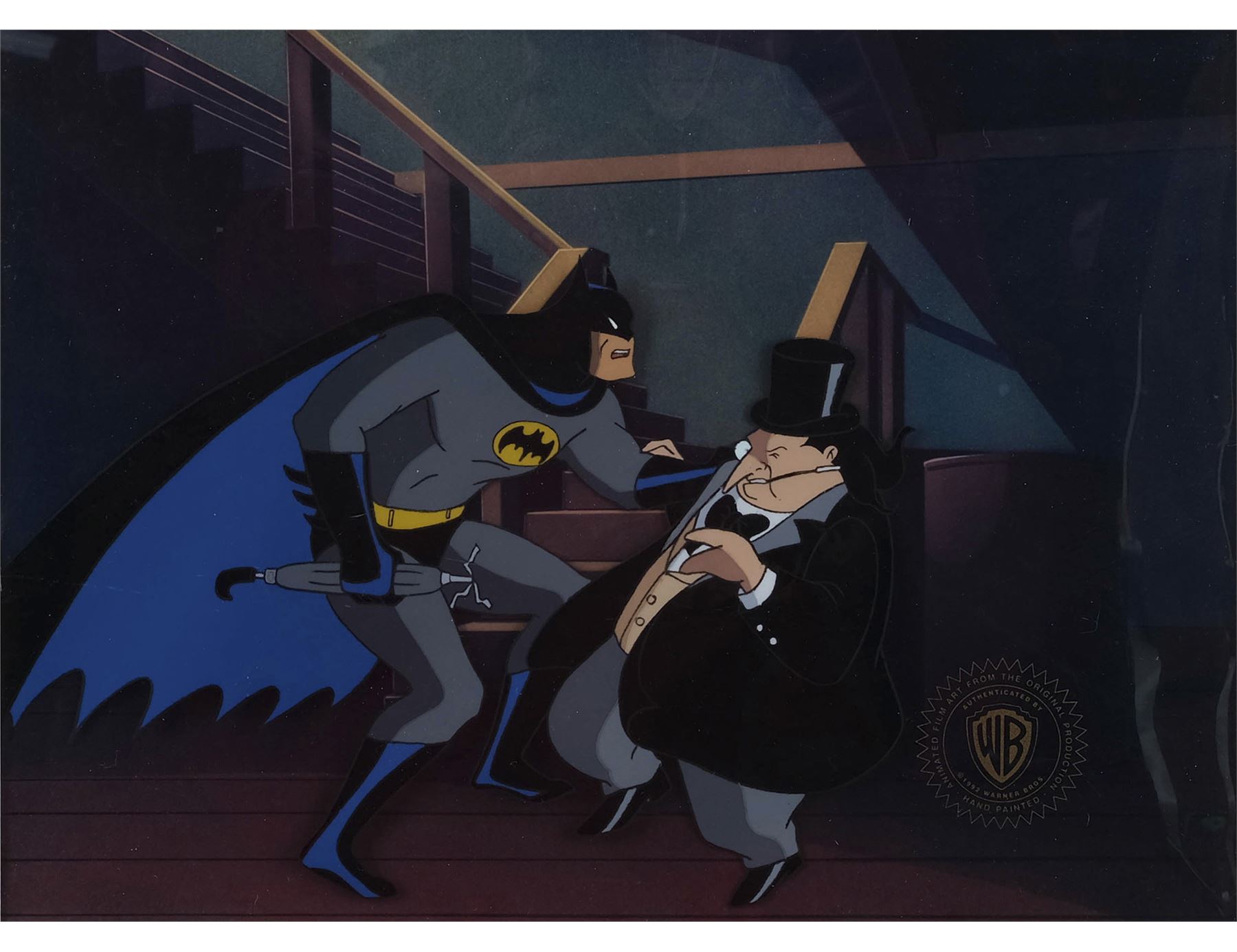 BATMAN: THE ANIMATED SERIES (1992-1995) - Hand-Painted Batman (Kevin Conroy) and The Penguin (Paul Williams) Animation Cel - A hand-painted Batman and The Penguin animation cel from the production of Batman: The Animated Series. After he awakened just in time, Batman grabbed The Penguin's umbrella and broke it before he returned to the fight.