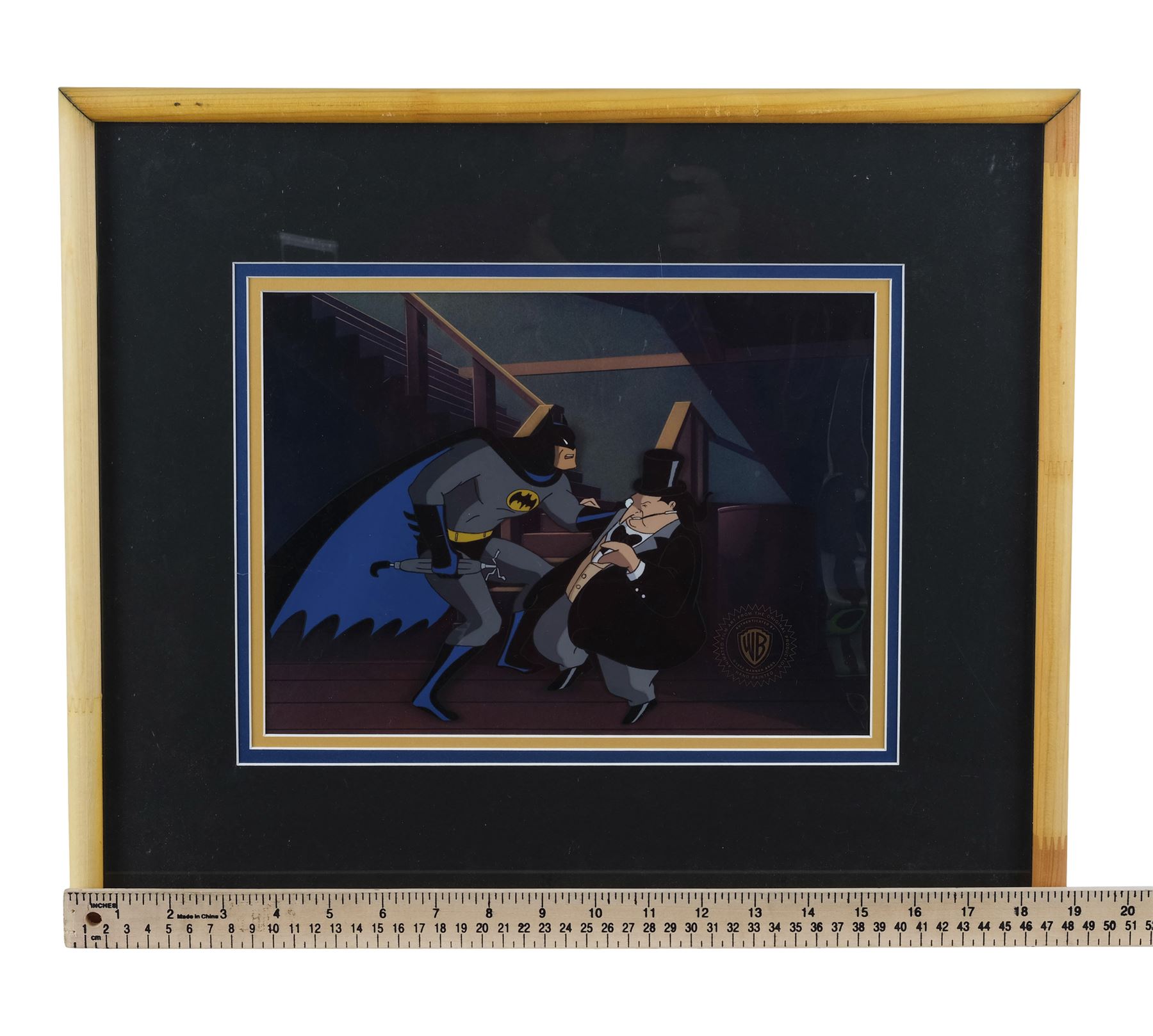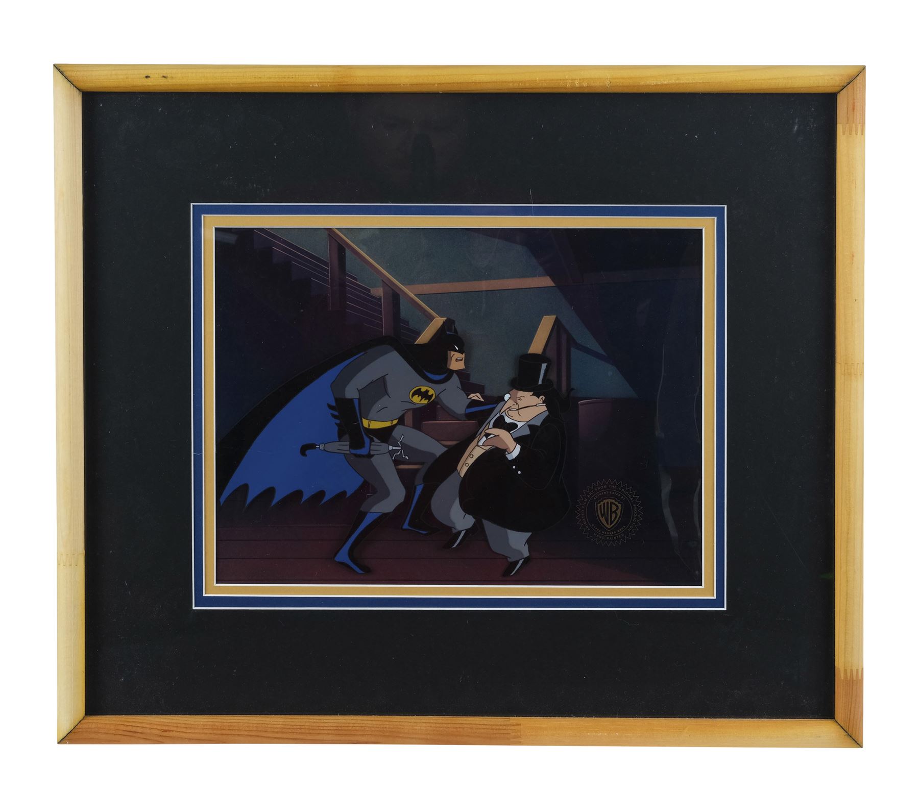 This framed and matted cel of Batman and The Penguin from Season 1, Episode 20, "I've Got Batman In My Basement" is hand-painted onto an acetate sheet over a still of the basement steps. This lot exhibits some scratches on the glass surface, and lifted adhesive on the back. Dimensions: 19" x 16" x 1.25" (48.25 cm x 40.75 cm x 3 cm)