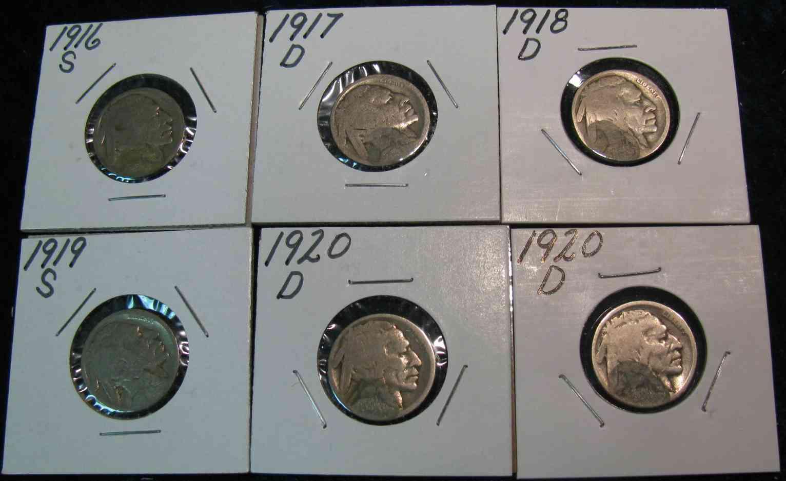 584. 1916S, 17D, 18D, 19S, & (2) 20D Buffalo Nickels. Restored dates. G-4 Redbook is $68.00