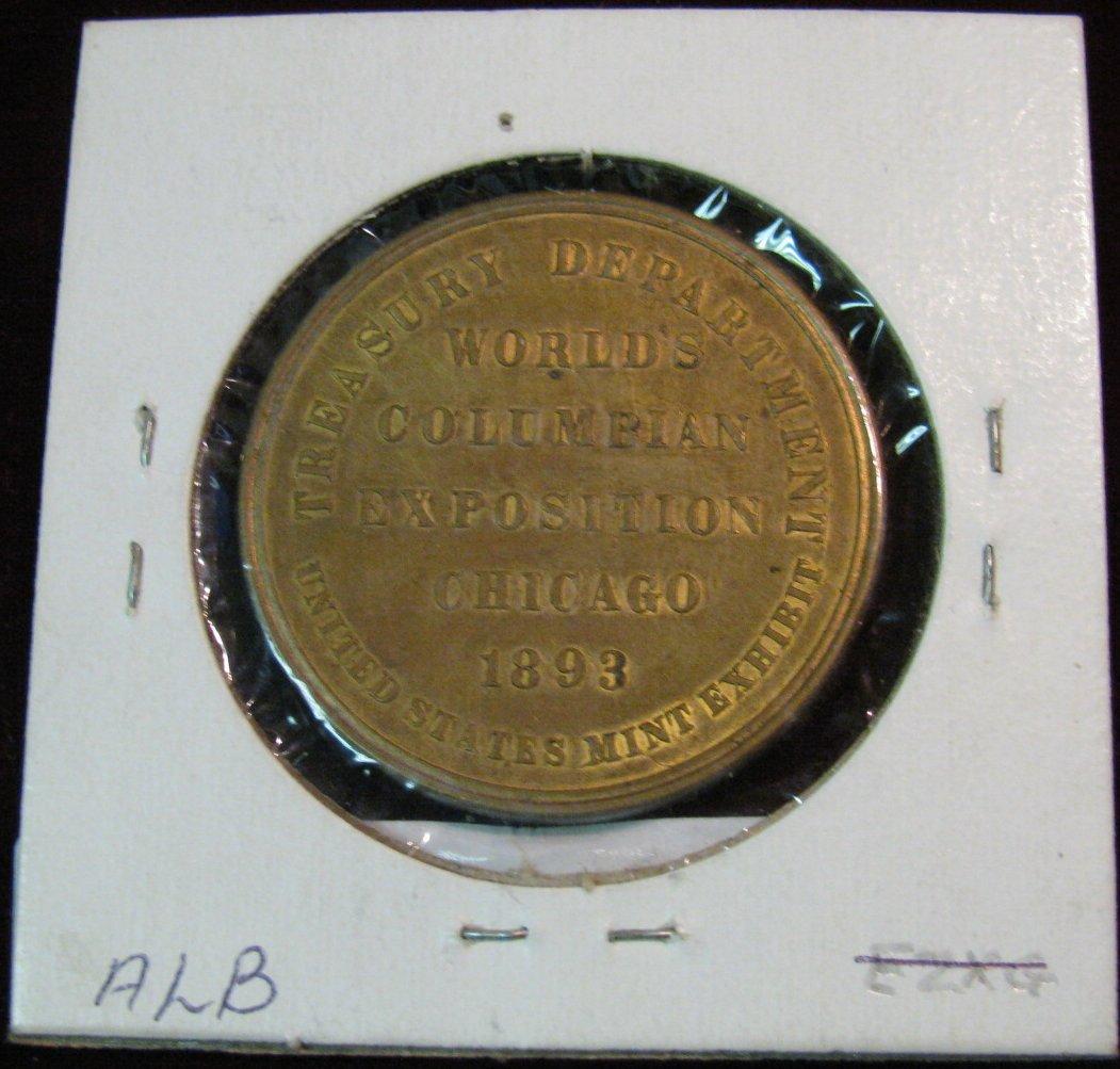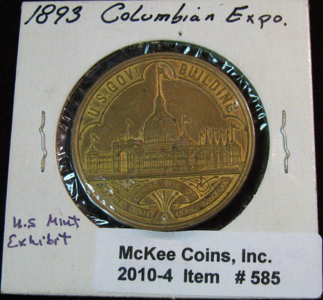 585. 1893 So-called Dollar. "Treasury Department/United States Mint Exhibit/World's/Columbian/Exposition/Chicago/1893", "U.S. Gov Building". Bronze. 38mm. EF.