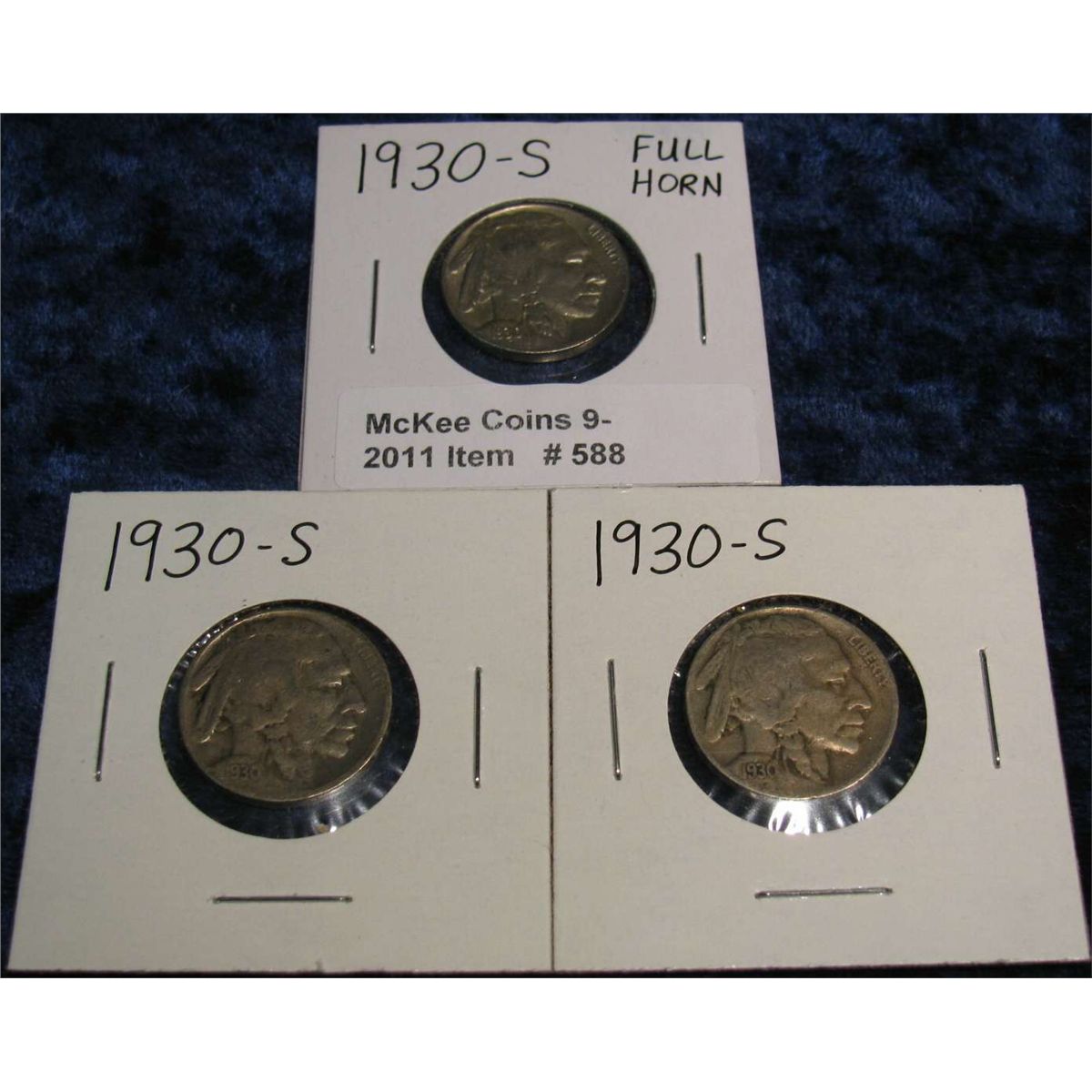 588. (3) 1930 S Buffalo Nickels. One has a nearly Full Horn.