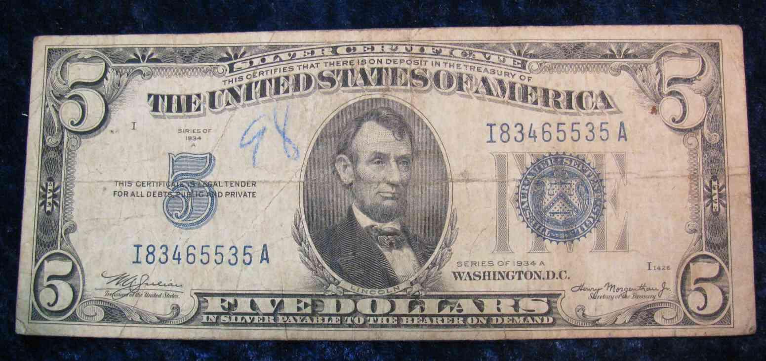 588. Series 1934A $5 Silver Certificate VG-8. Numbering in field