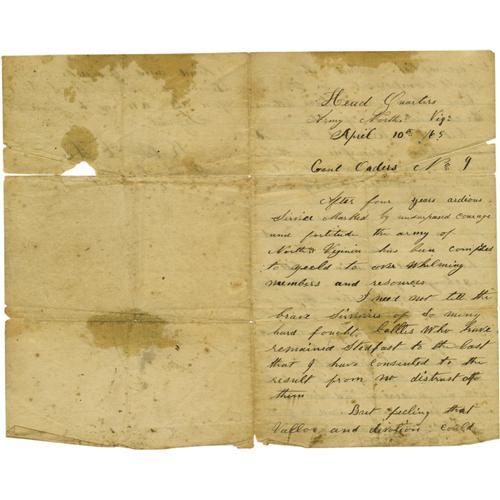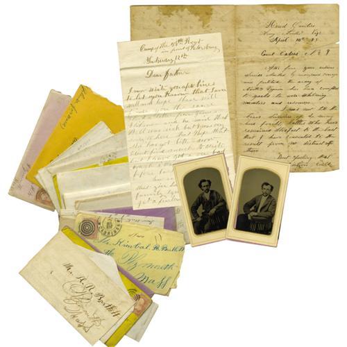 <B>58th Massachusetts Volunteer Grouping that includes a Manuscript Copy of Lee's General Orders No. 9.</B></I> Over fifteen letters, approximately 45 pages, 5" x 7.5", 1864-65, various Virginia locations to Plymouth, Massachusetts. These letters, in both ink and pencil, were written by Private Ansil T. Bartlett and were primarily sent to his father in Plymouth. Many of them have covers carrying Alexandria, Virginia postmarks and 3-cent rose stamps. The 58th Massachusetts was raised in 1864 for three years and was immediately sent to the front where it participated in the siege of Petersburg and its associated battles. Private Bartlett found himself in a sorry state in short order. A June 18, 1864 letter reads in part: "<I>Dear father and mother, I now in Washington at the hospital sick and should like to see you very much and should like to have you come on and see me. I do not weigh more than 100 pounds now...you must excuse my bad writing because I am not fit to hold a pen in my hand I am so weak and tremble very bad.</B></I>" Other letters are datelined at Petersburg. This grouping also includes two civilian 1/9th plate tintypes of Bartlett taken after the war. One of these carries a verso inscription that states he lost a leg in the war and later became an RFD mailman. An enigma in this collection is a period manuscript copy of General Robert E. Lee's famous General Orders Number 9, which served as his farewell to his beloved Army of Northern Virginia. The letters average very good condition; the tintypes are in fine condition; Lee's General Orders are only in fair condition with considerable soiling , splits and areas of paper loss.<BR><BR><b>Shipping:</b> Small Flat (<a target="_blank" href="http://www.heritageauctions.com/common/shipping.php">view shipping information</a>)