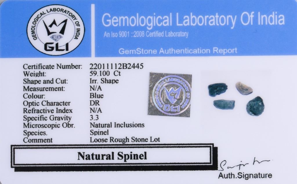 Lot of 4 59.10 ct (total) irregular shape rough blue natural spinel. Accompanied with GLI certificate.