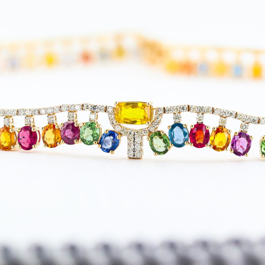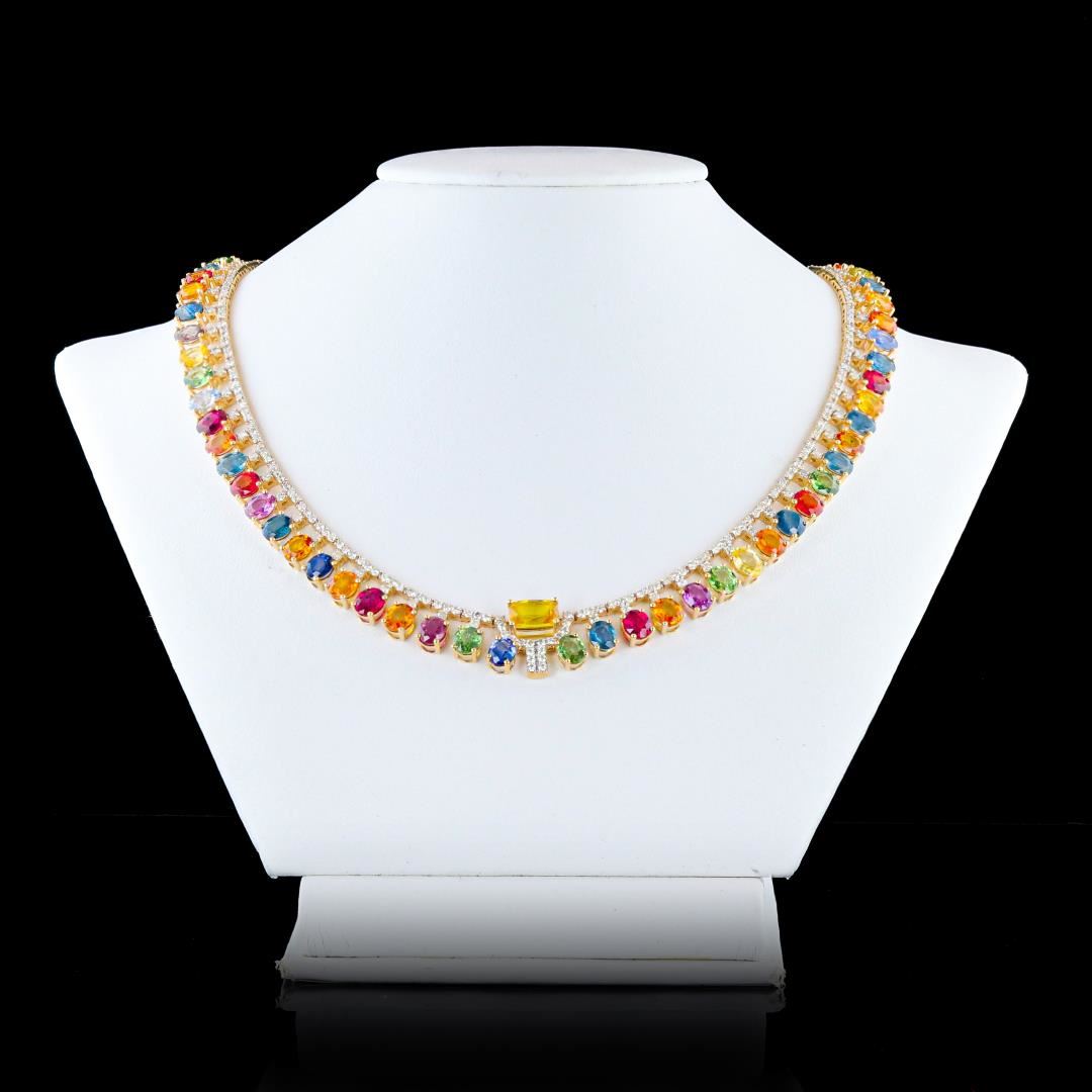 One polished, stamped, and tested 14K yellow gold necklace marked Oscar Friedman The necklace is mounted with 75 genuine sapphires weighing approximately 59.17 carats, and 305 genuine round diamonds weighing approximately 6.27 carats. The necklace measures 17.25 inches in length and is finished with a tension locking clasp and folding safety clasp. This item weighs 53.0 grams, condition is new, excellent workmanship. #MAIN GEMSTONES# Species: Natural Corundum Variety: Sapphire Shape: Cushion / Oval Cutting Style: Brilliant Cut Crown, Step Cut Pavilion Quantity: 75 Sapphires Measurements: 5 x 3 - 6 x 4mm (74 oval), 9 x 6mm (1 cushion) Total Weight: 59.17 carats Color: Various Colors Transparency: Transparent Refractive Index: 1.762 - 1.770 DR Birefringence: 0.008 - 0.010 Hardness: 9 #ADJACENT GEMSTONES ON NECKLACE# Identity: Natural Diamond Shape: Round Cutting Style: Brilliant Cut Quantity: 305 Diamonds Measurements: 1.5 - 18mm Total Weight: 6.27 carats Color Grade: G-I Clarity Grade: SI1-I2 Refractive Index: 2.417 Hardness: 10 TOTAL SAPPHIRE WEIGHT: 59.17 cts TOTAL DIAMOND WEIGHT: 6.27 cts WEIGHT OF ITEM: 53.0 grams GOLD CONTENT: 14K Yellow Gold Size: 17 1/4