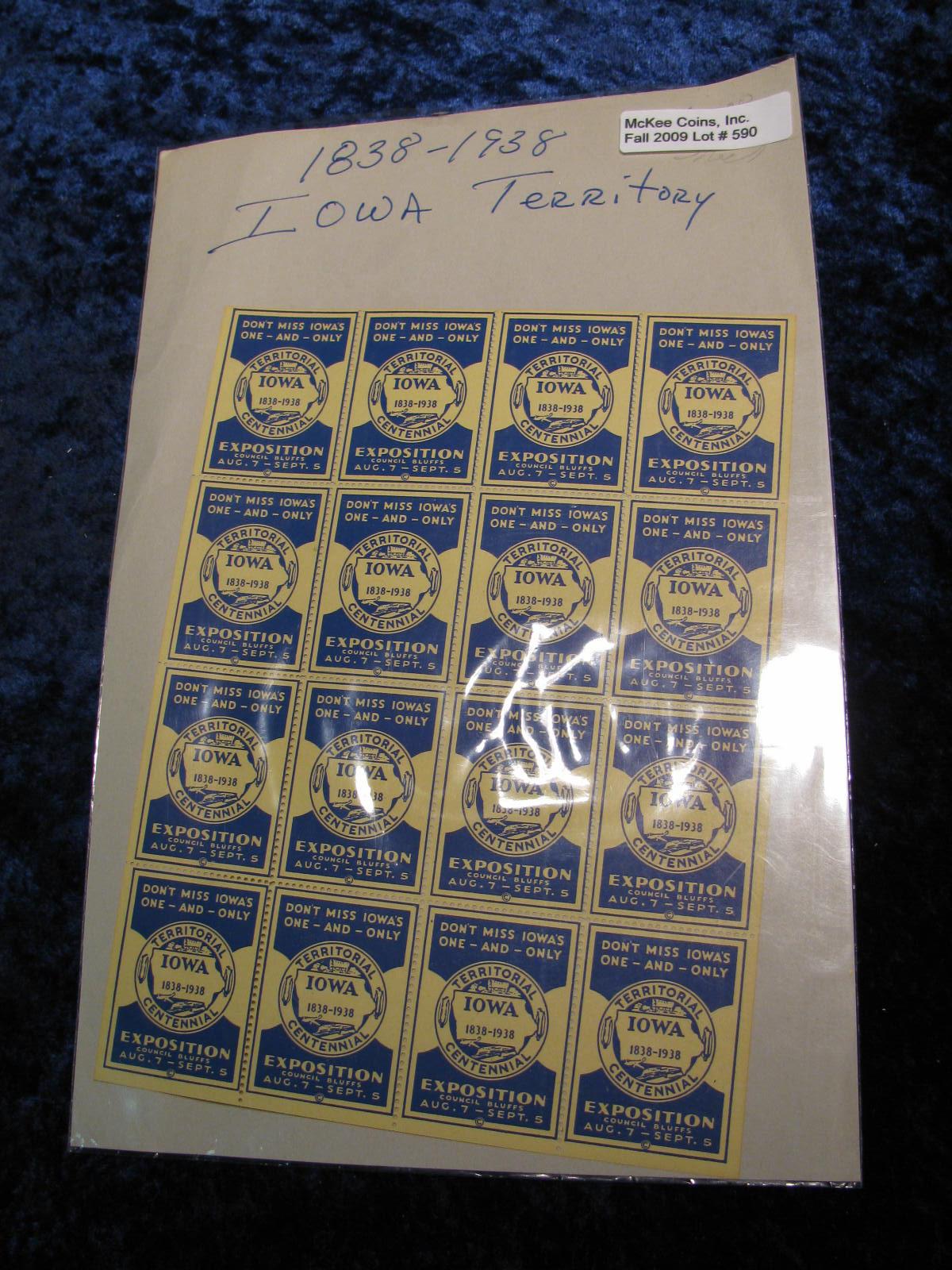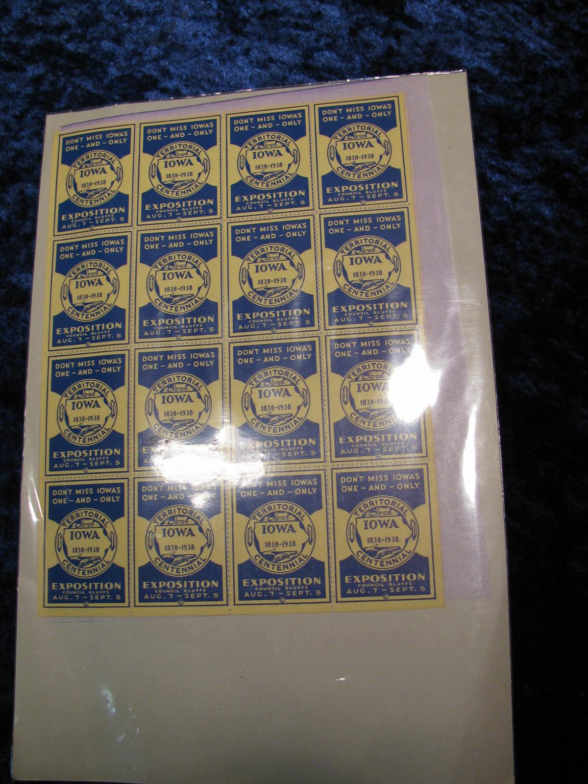 590. 1838-1938 Iowa Territorial Mint Sheet of Exposition Seals. (16 seals total). Estimated value of $60.00.