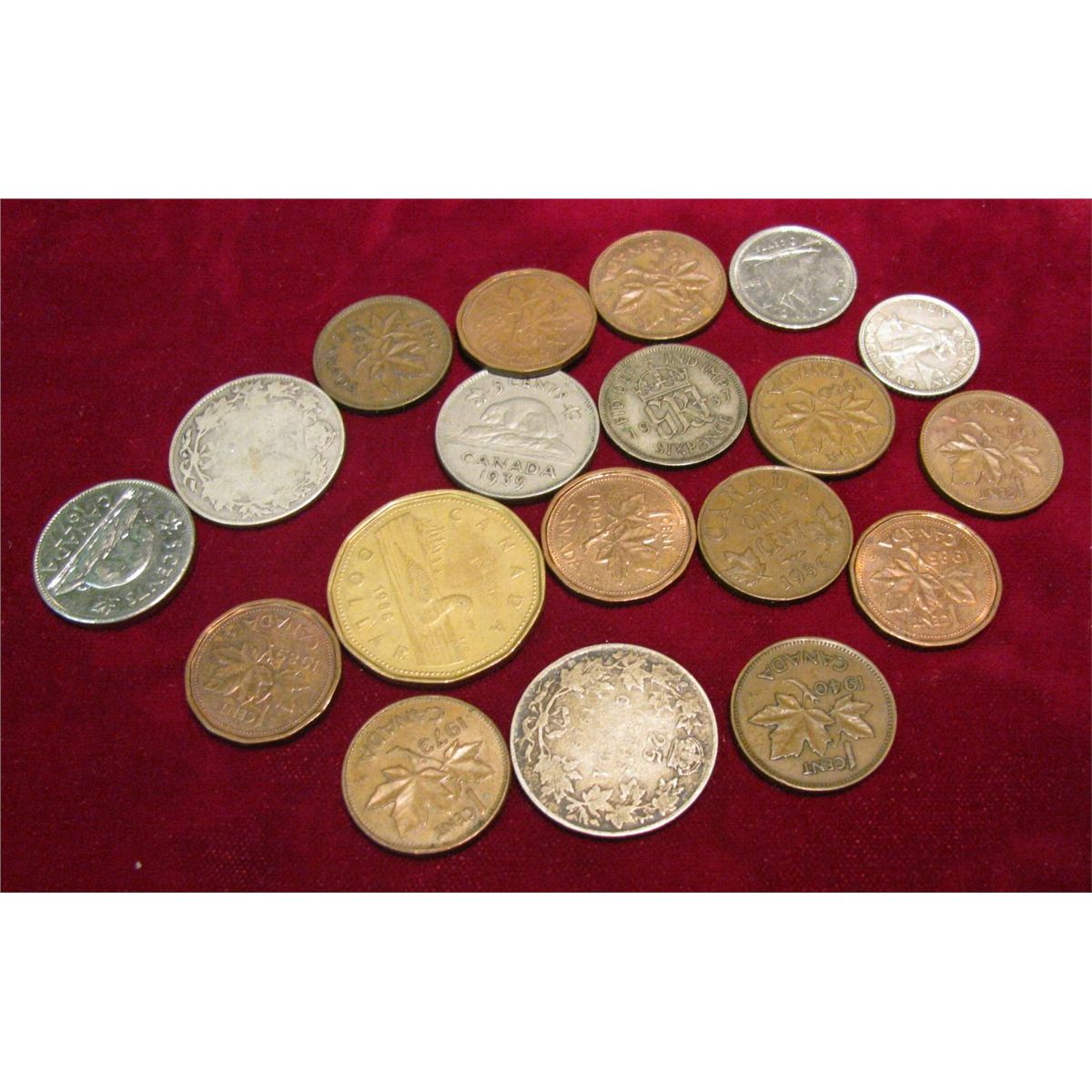 592. (2) Canada Silver Quarters (one is a 1919); (11) Canada Cents; 1945D Silver Philippines 10c; (2) Canada Nickels; Canada dime & Loon Dollar; & a Silver 1937 Great Britain 6 Pence.