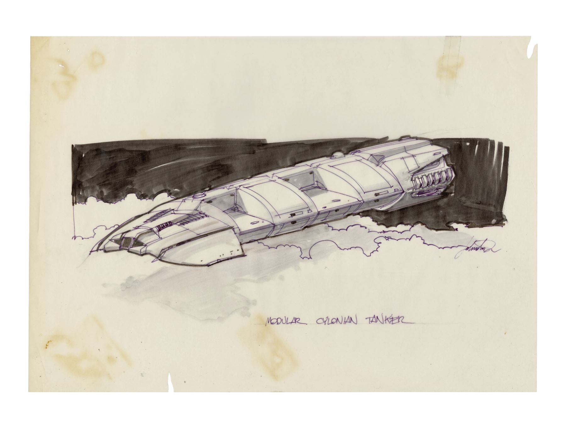 BATTLESTAR GALACTICA (1978-1979) - Hand-Drawn Joe Johnston Modular Cylonian Tanker Concept Sketch - A concept sketch of a modular Cylonian tanker hand-drawn by effects illustrator and designer Joe Johnston for the production of Glen A. Larson's Battlestar Galactica. The Cylons used tankers to transport fuel and other supplies to their raiders throughout the series, beginning with Richard A. Colla's pilot film "Saga of a Star World."