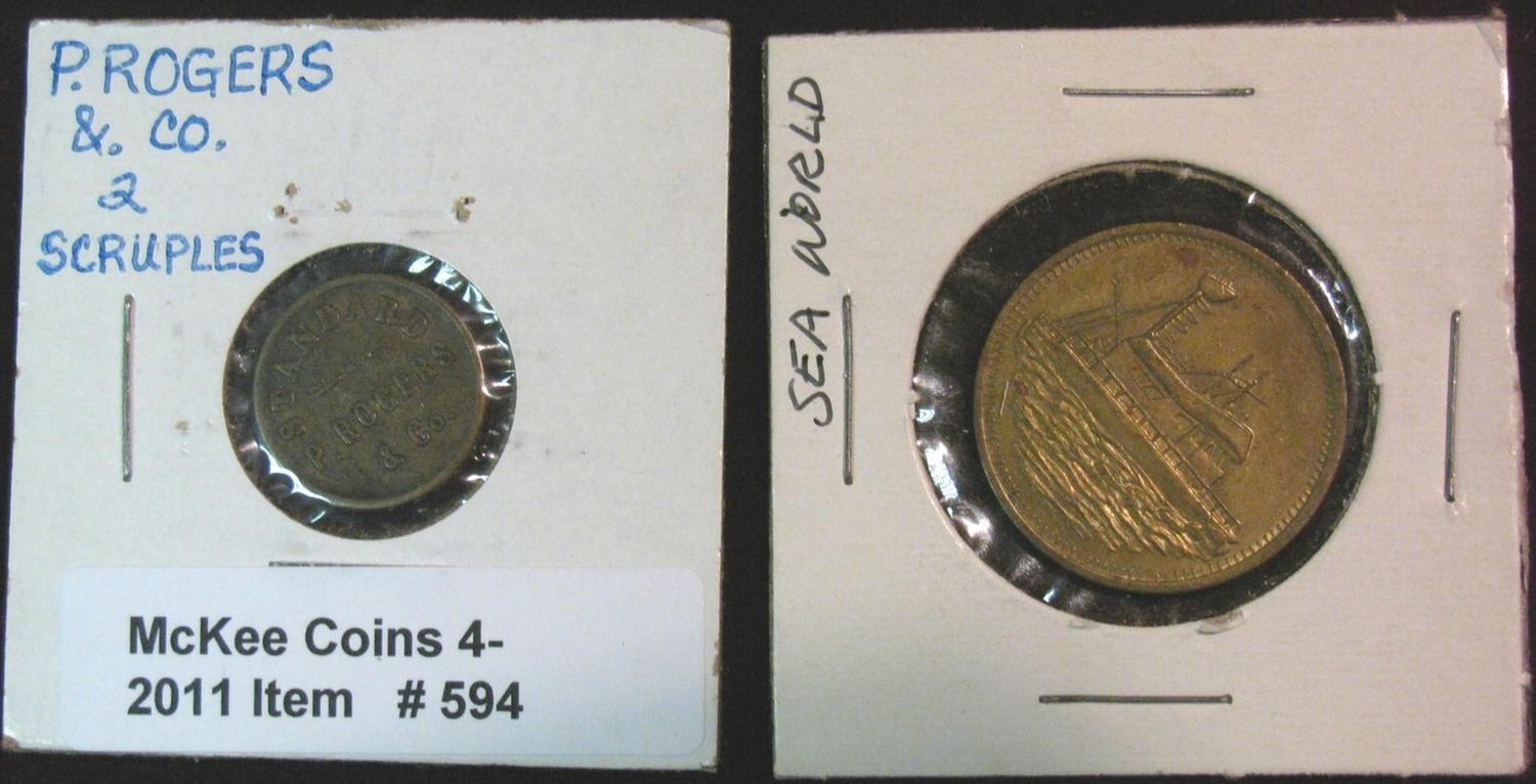 594. "P. Rogers & Co. 2 scruples" Token & a Sea World Token.