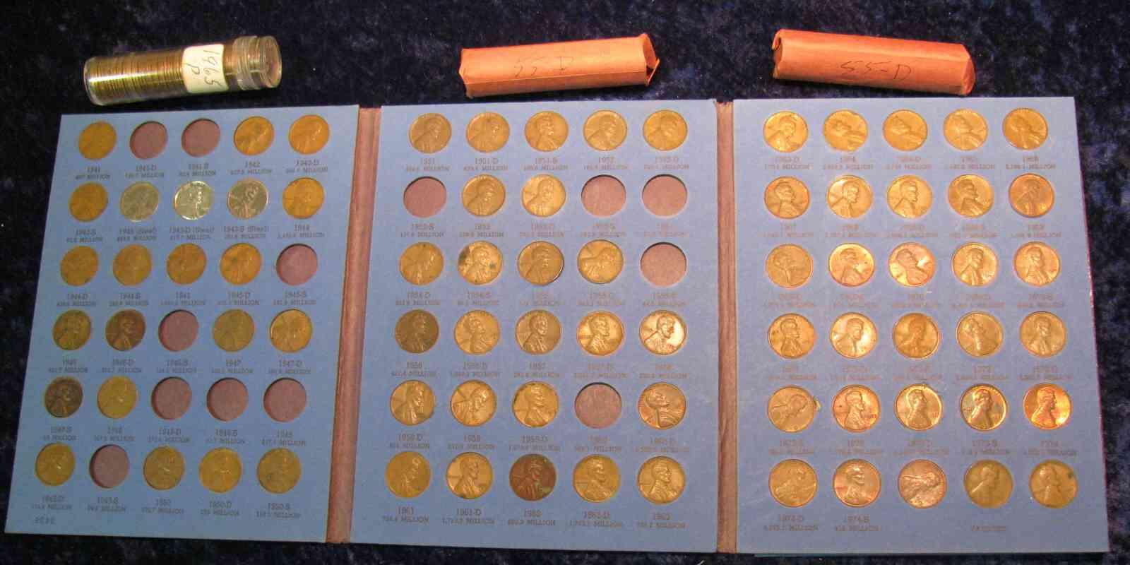 595. (2) 1955 D Circ Cent Rolls; 65P BU Cent Roll; & 1941-74 Partial Cent Set in a Whitman folder.