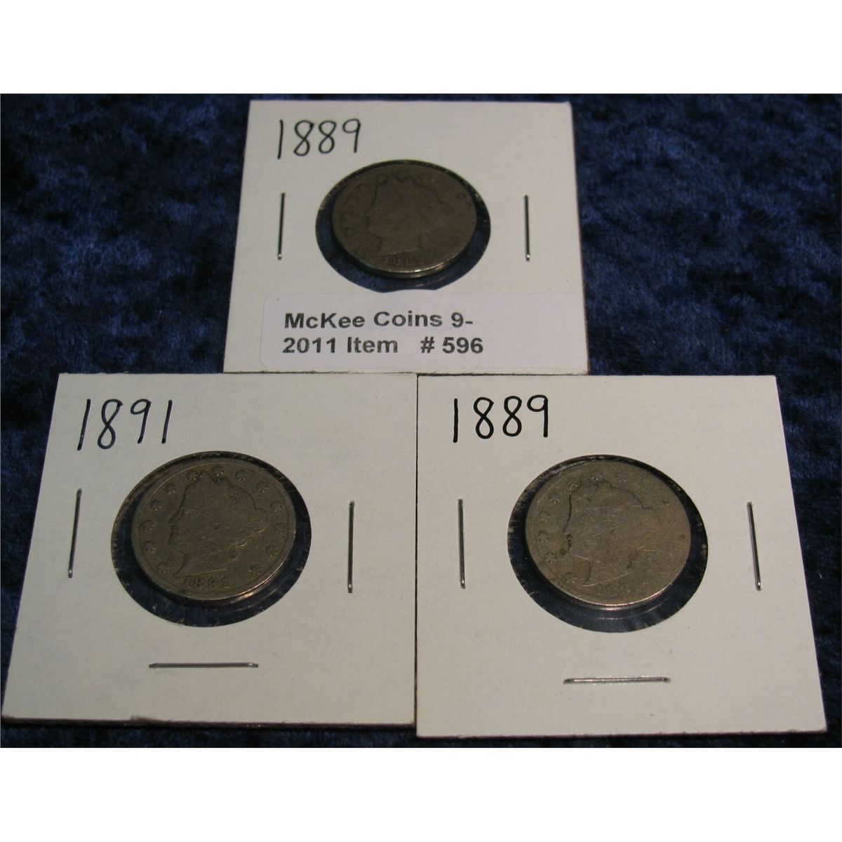 596. (2) 1899 & 1891 Liberty Nickels. Circulated.