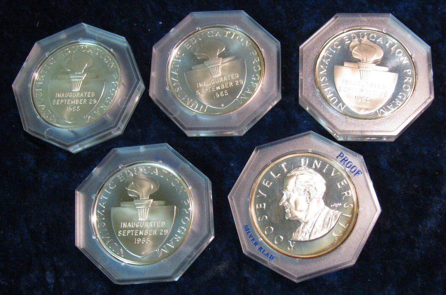 597. (5) Roosevelt University Proof Silver Klad Medals. "Numismatic Education Program/Inaugurated/September 29/1965". Each encapsulated. 38mm.