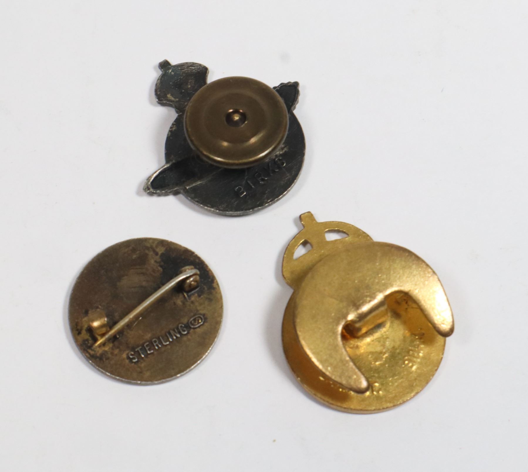 ROYAL CANADIAN AIR FORCE REVERSE BIRKS MARKED ON REVERSE PIN WOMENS WAR WORK STERLING MARKED ON REVERSE PIN AND BRITISH CIVILI DEFENCE CORPS PIN WORLD WAR TWO INSIGNIA