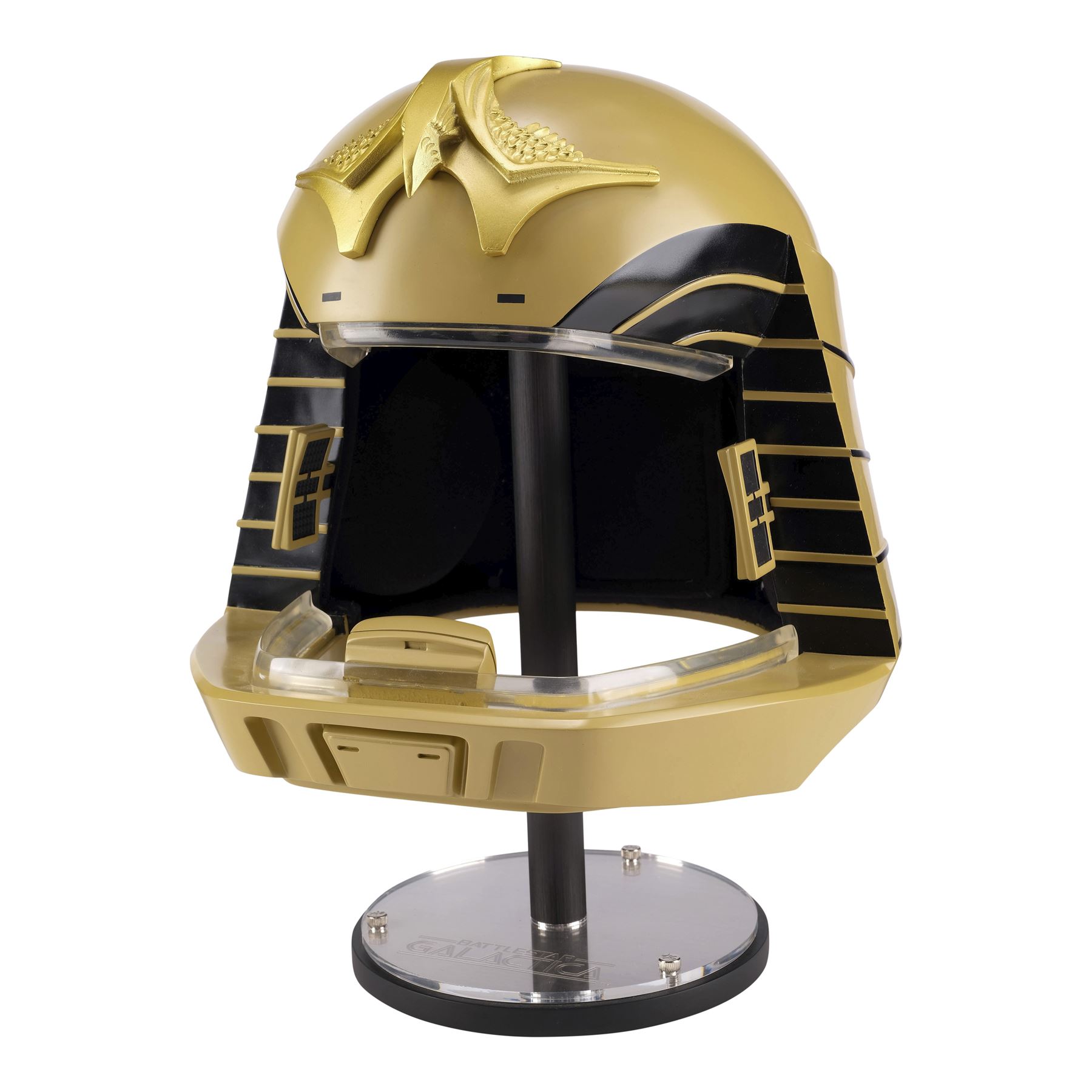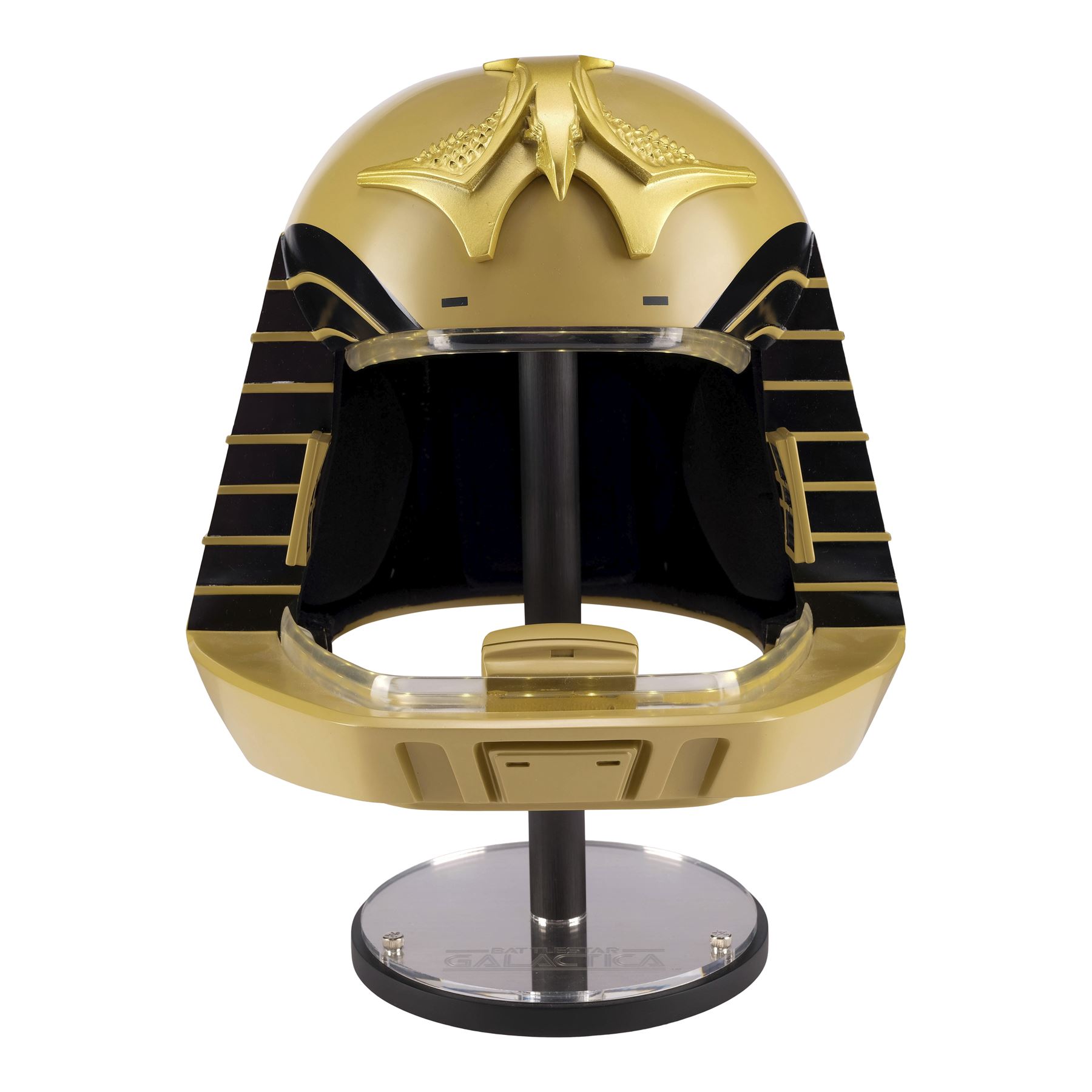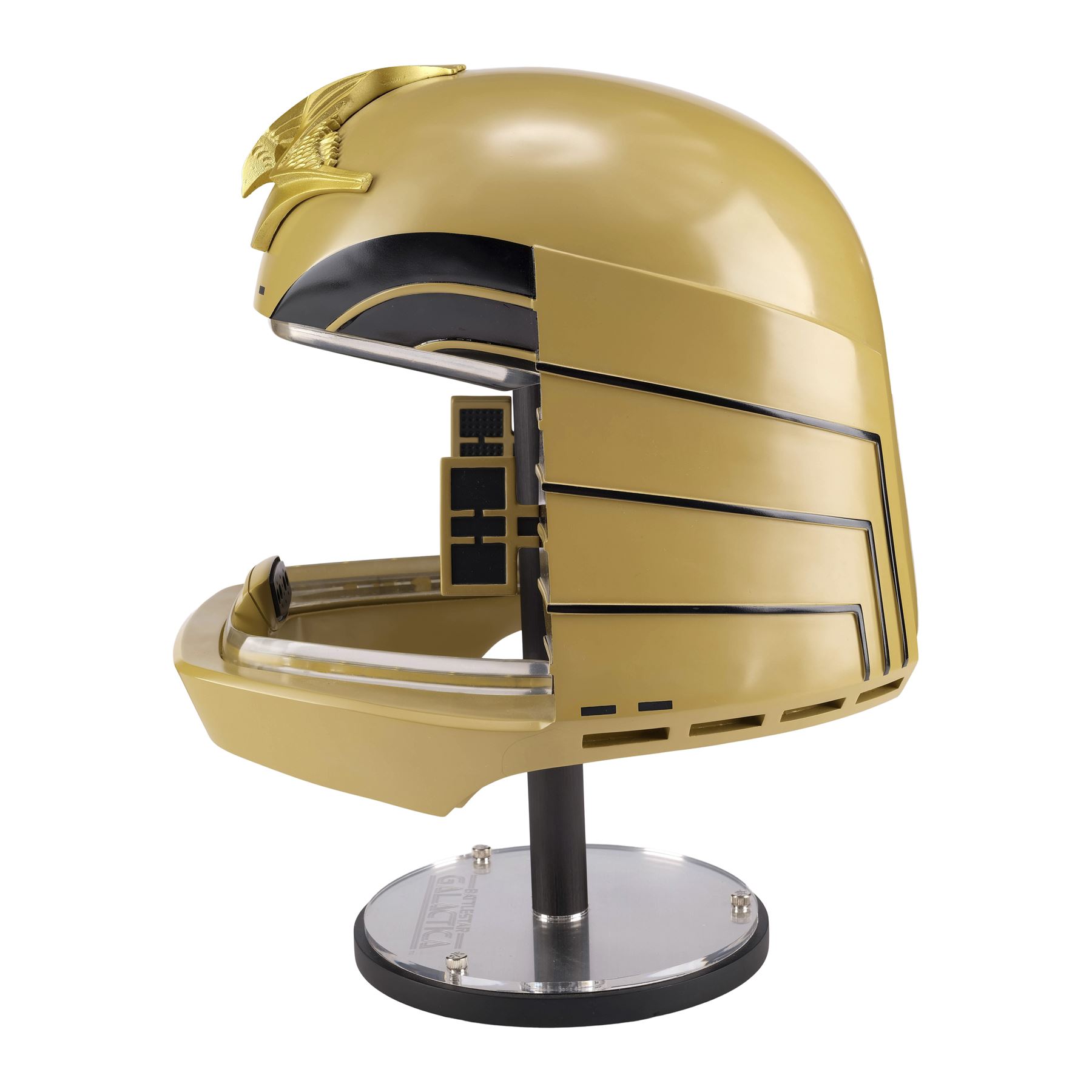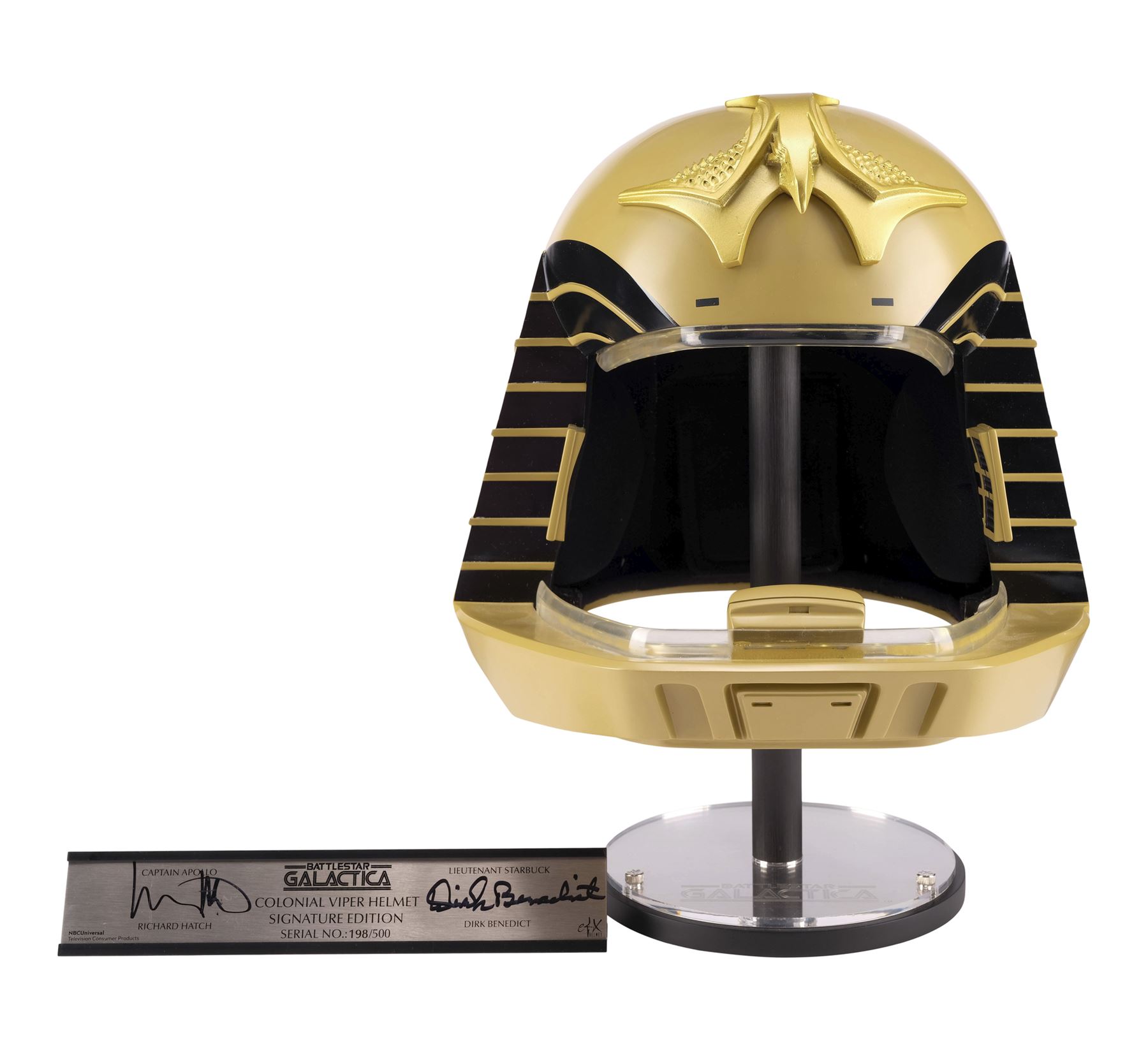 Created by eFX Collectibles, this lot consists of one 1:1 replica helmet. Made of fiberglass and resin, this gold-color helmet features two tracks of LED lights around the face opening, as well as the iconic bird-like emblem on top, black foam lining, a microphone, and earpieces. It is powered by three AA batteries accessible at the back beneath a pad of foam, and an on/off switch. This helmet comes with a custom-made eFX stand and a numbered display plaque autographed by Richard Hatch and Dirk Benedict. It is numbered "198/500." Dimensions: 12.5" x 12.5" x 15.5" (31.75 cm x 31.75 cm x 39.5 cm)