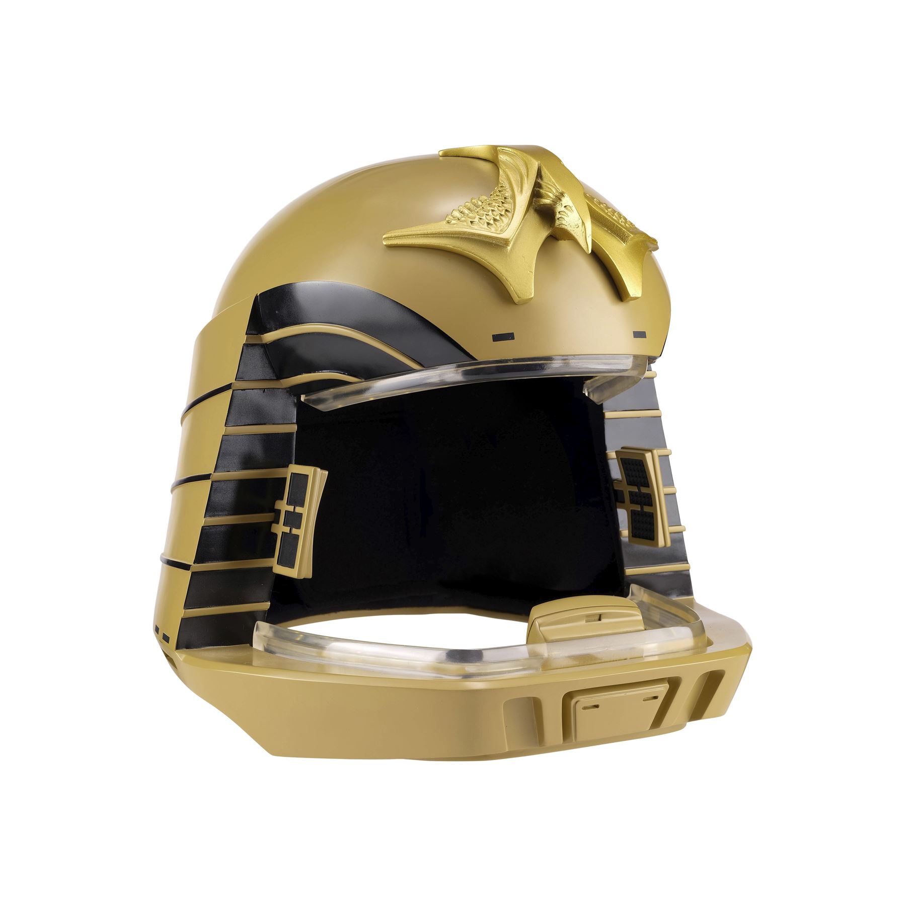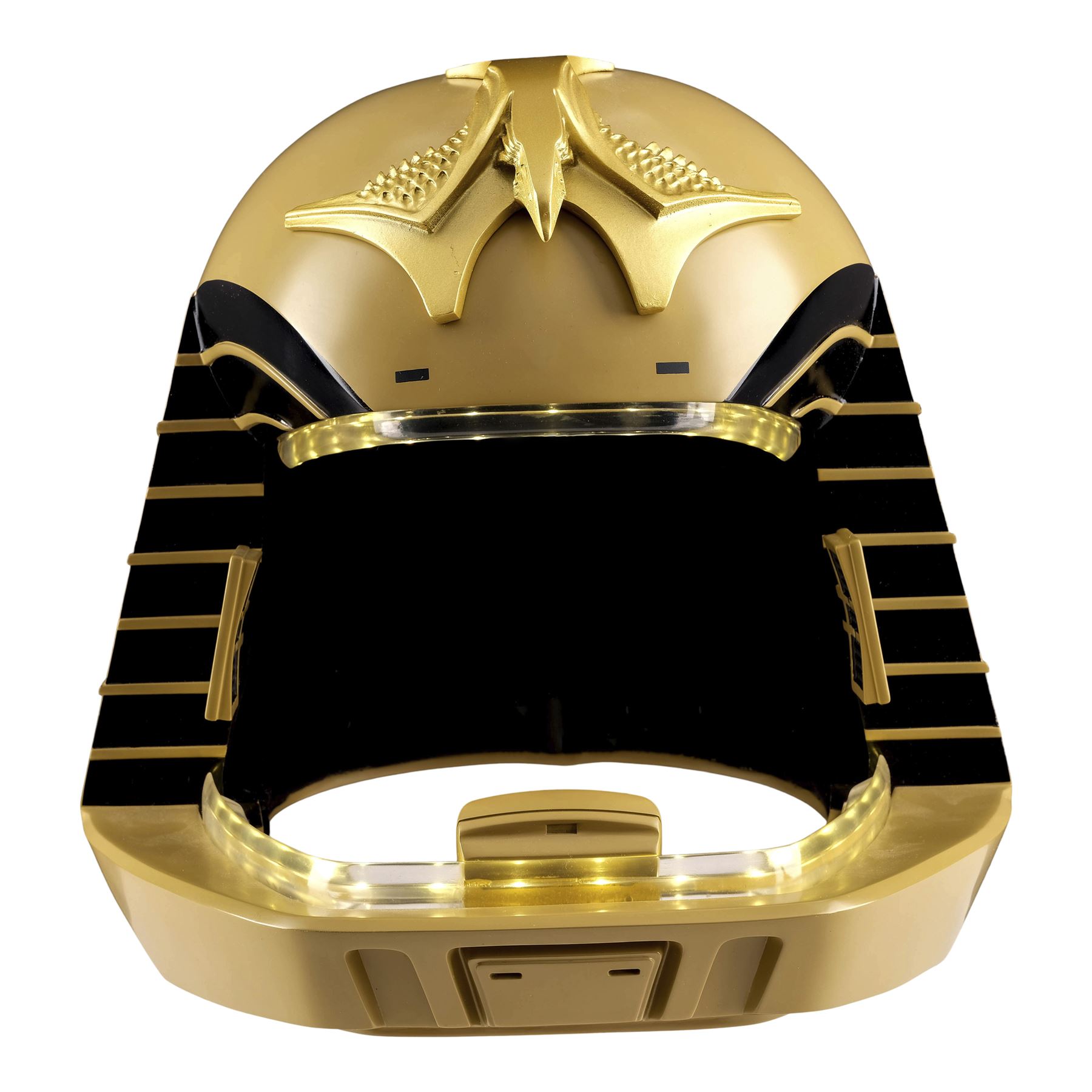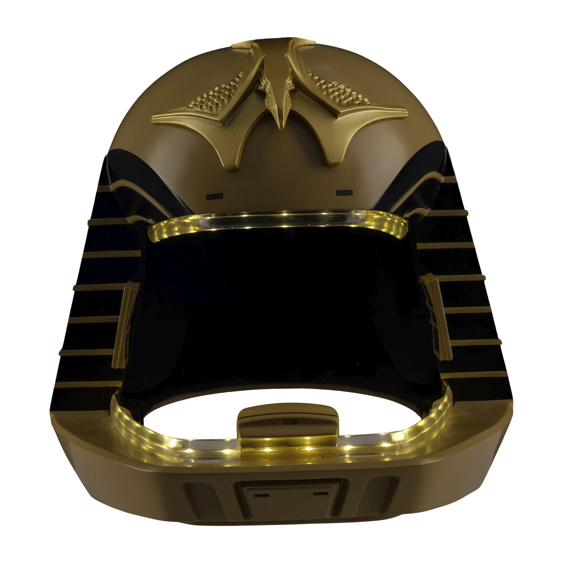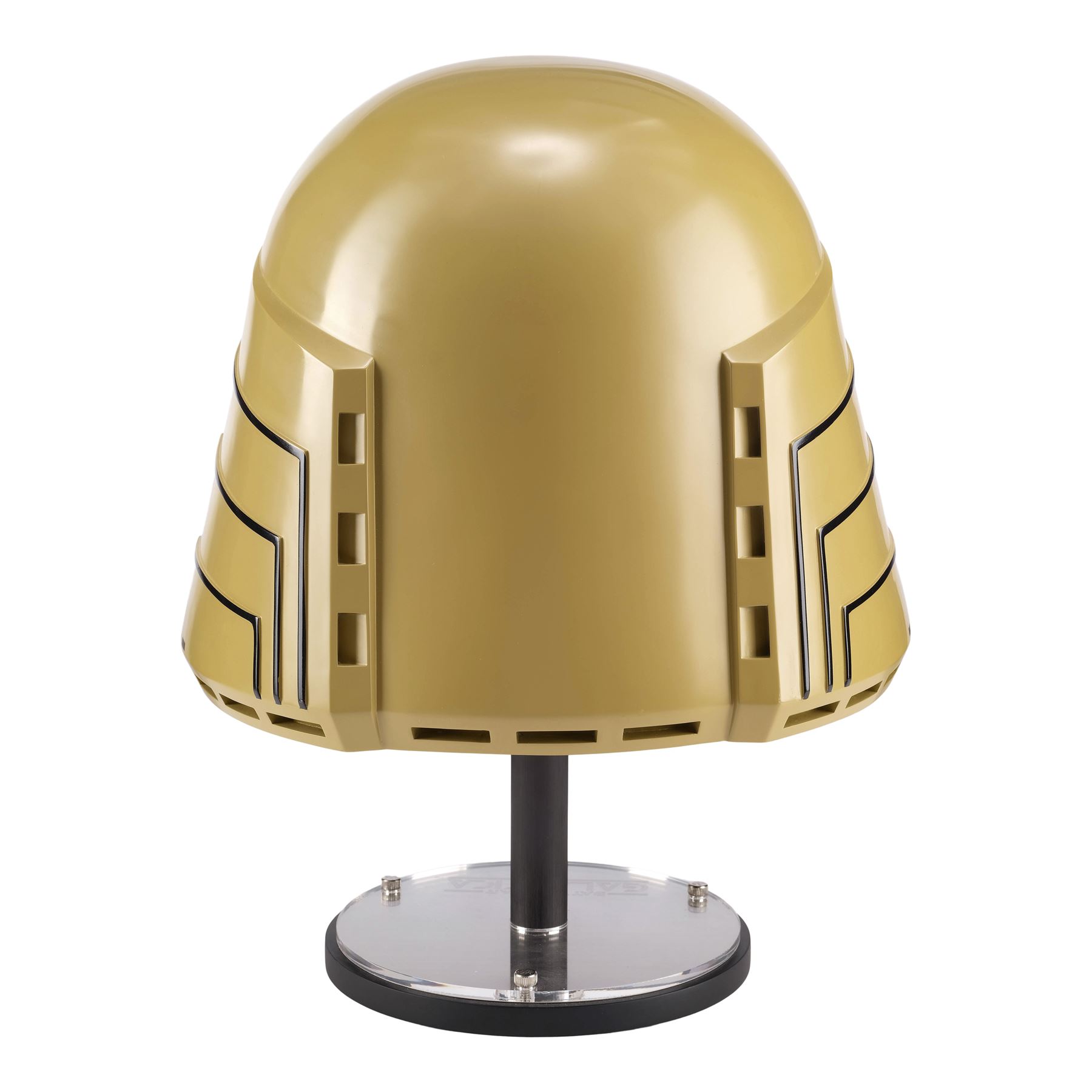 Created by eFX Collectibles, this lot consists of one 1:1 replica helmet. Made of fiberglass and resin, this gold-color helmet features two tracks of LED lights around the face opening, as well as the iconic bird-like emblem on top, black foam lining, a microphone, and earpieces. It is powered by three AA batteries accessible at the back beneath a pad of foam, and an on/off switch. This helmet comes with a custom-made eFX stand and a numbered display plaque autographed by Richard Hatch and Dirk Benedict. It is numbered "198/500." Dimensions: 12.5" x 12.5" x 15.5" (31.75 cm x 31.75 cm x 39.5 cm)