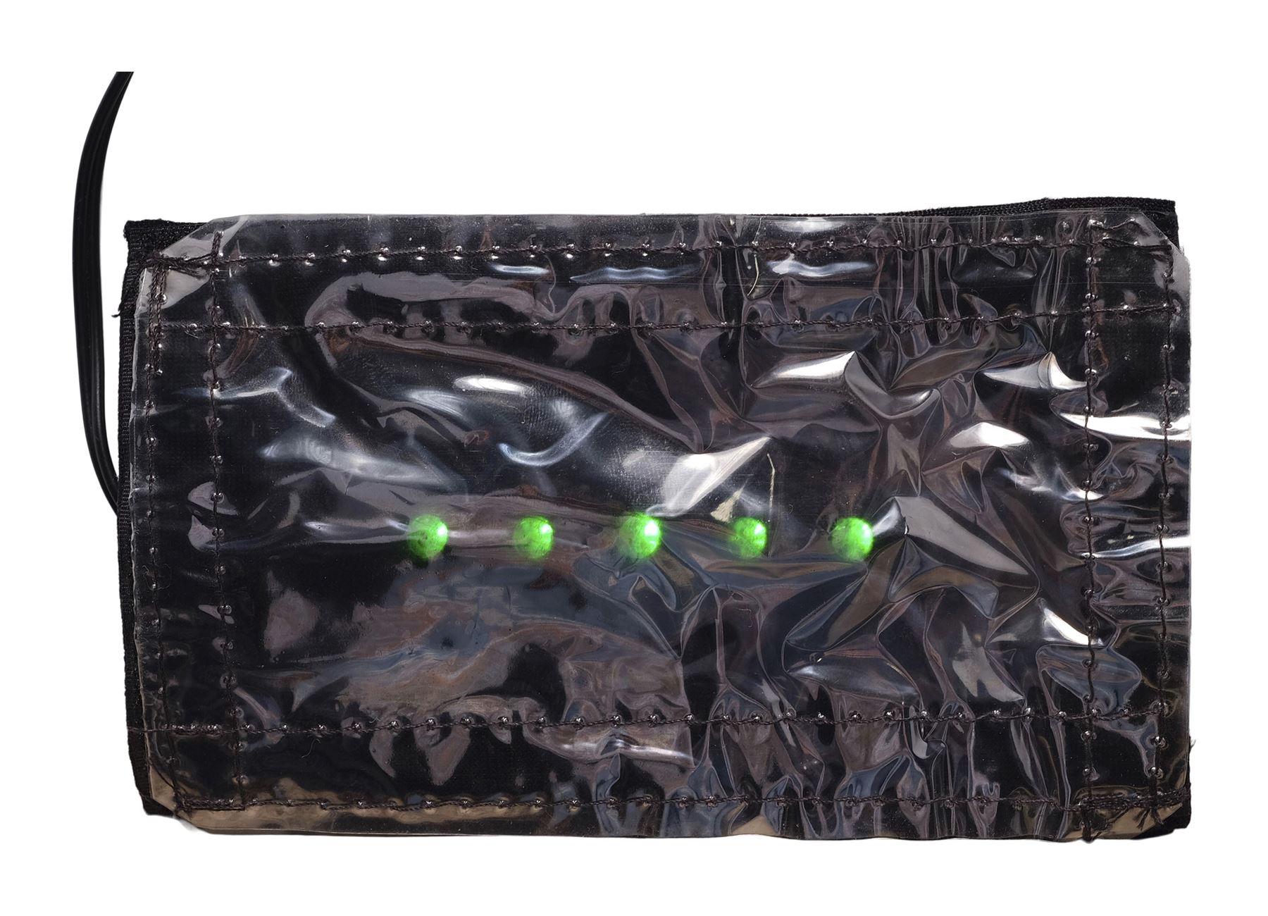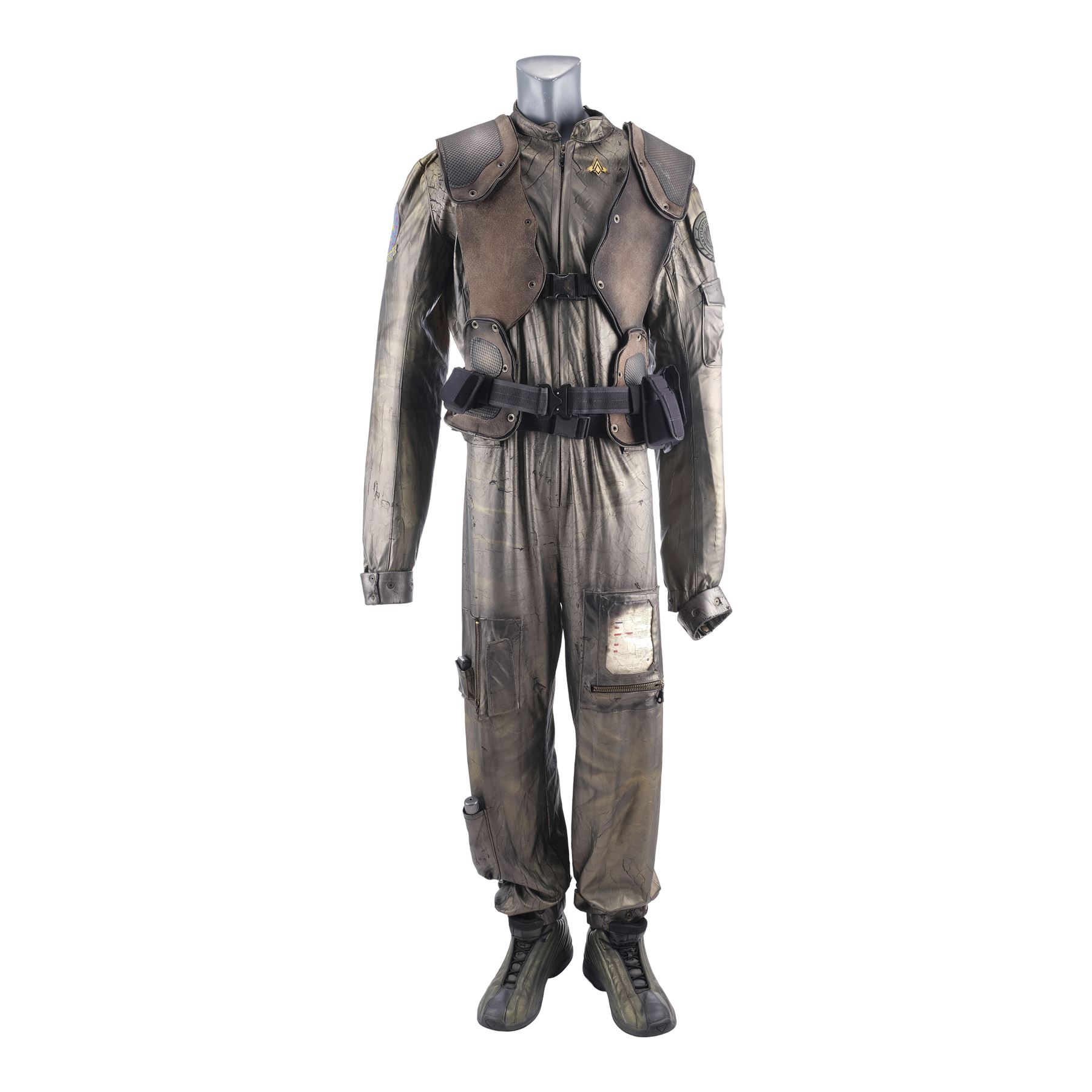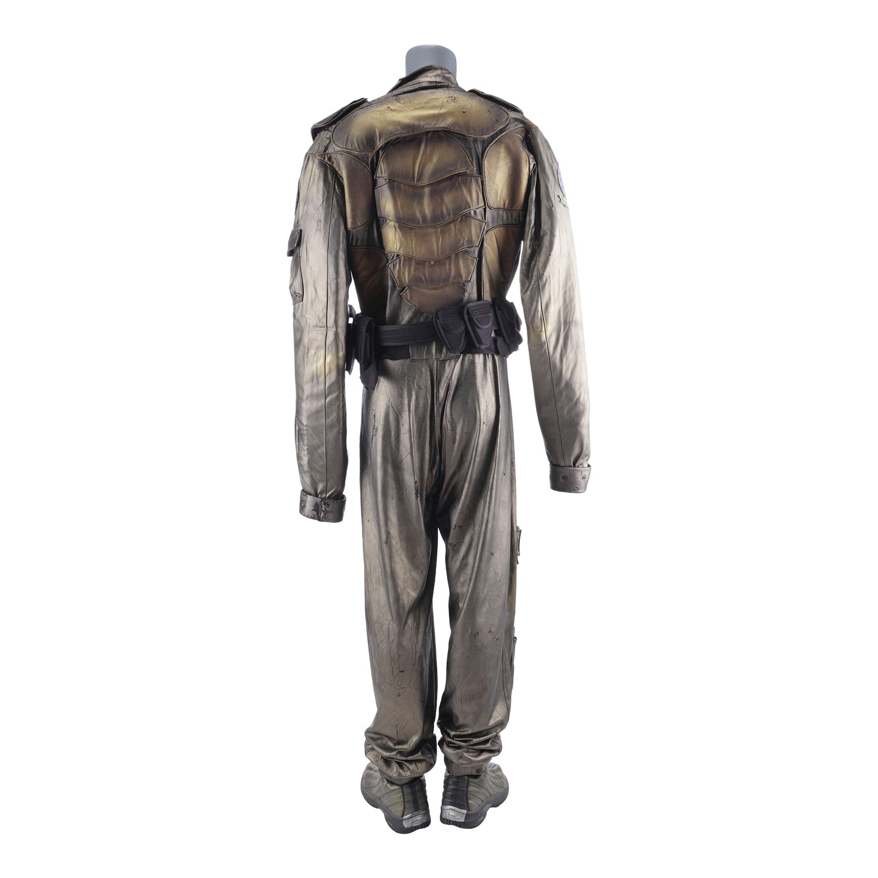 This costume features an electrum-colored vinyl zip-up jumpsuit with a brown padded vinyl vest; a vinyl and felt wrist attachment with interior electronic components; and matching leather shoes (Men's U.S. size 9.5). The jumpsuit has patches on each shoulder, a Raptor and a Battlestar Galactica insignia, and a metal Major rank pin on the collar and Junior Pilot Wings pin on the left breast, with a pre-flight checklist in a window pocket on the left knee. The vest's interior is hand-marked "2005 ML - L." The interior of the shoes features strips of hand-marked tape, but the writing has since become illegible due to fading. The lot also includes a black nylon tactical belt. This costume exhibits cracked vinyl, which has become fragile with age, and should be handled with care.