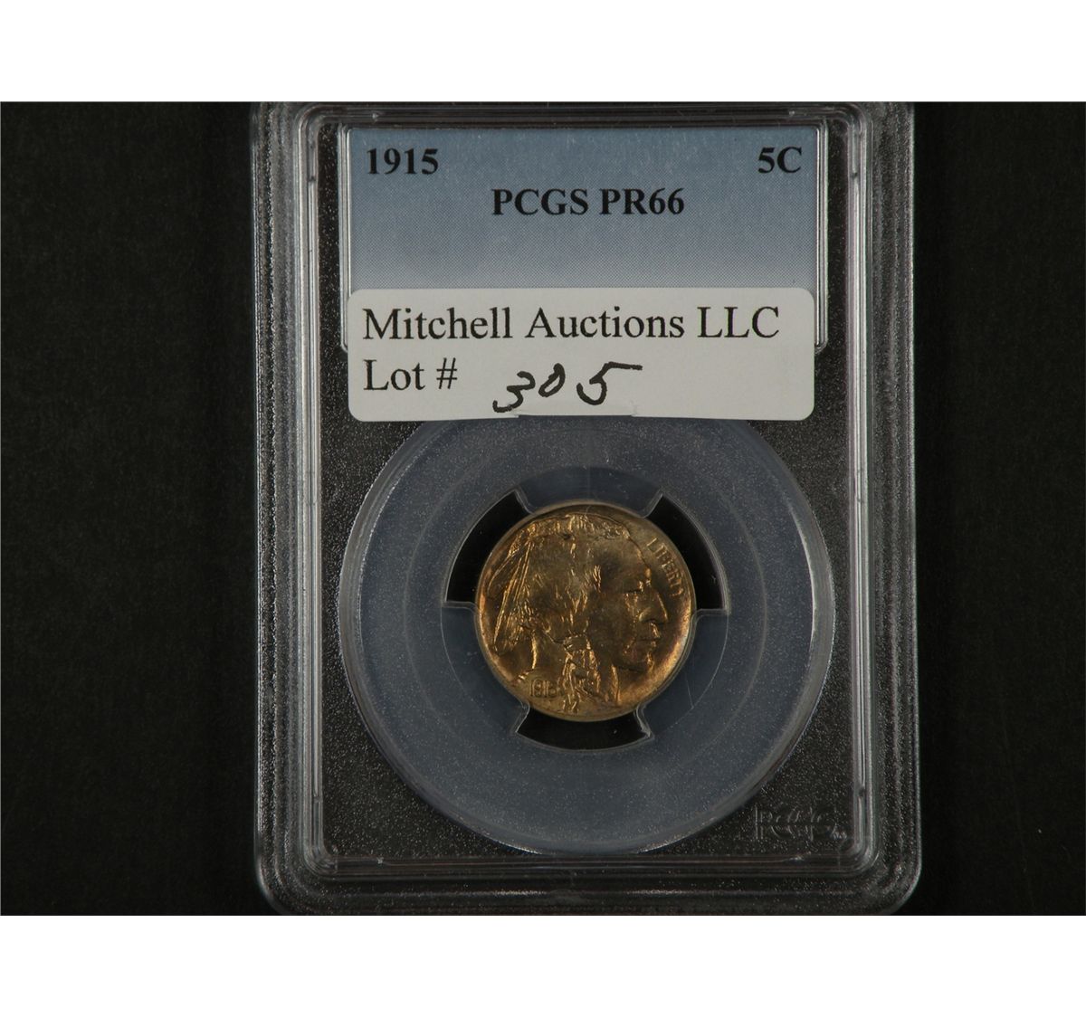5C 1915 PCGS PR66. This lovely Matte Proof is bathed in rich golden toning. Glistening underlying surfaces are remarkably vibrant for a proof struck in this matte format. Only 1,050 such pieces were struck, most of which are clearly inferior to this specimen. Est.$2,000