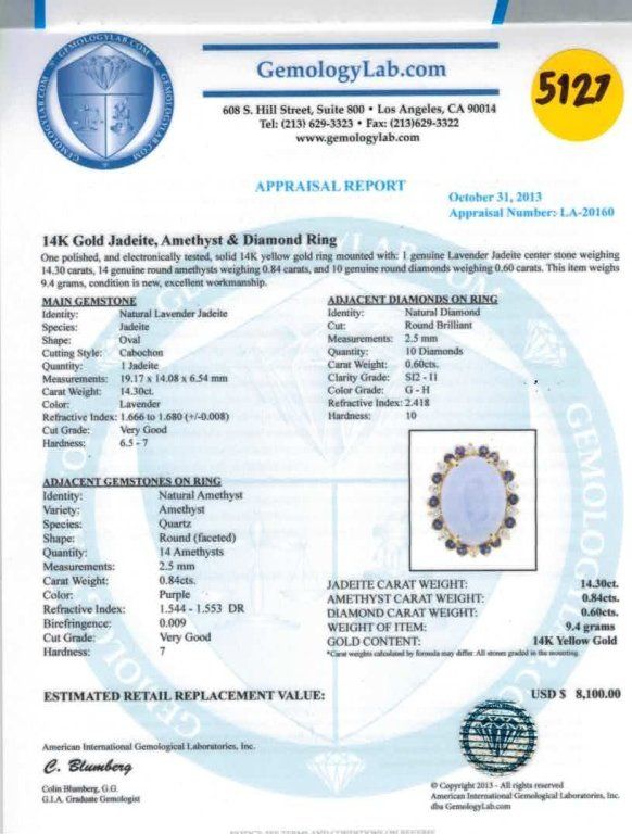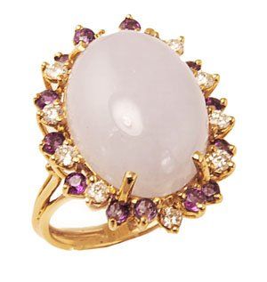 5Fine Lavender Jadeite, Amethyst, Diamond Ring 14K