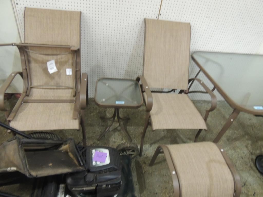 ADJUSTABLE CHAIR, FOOT STOOLS, SIDE TABLE, CASTLE CREEK SET, PATIO SET, NEW OUTDOOR FURNITURE AS SHOWN SEE PHOTO FOR MORE DETAILS.