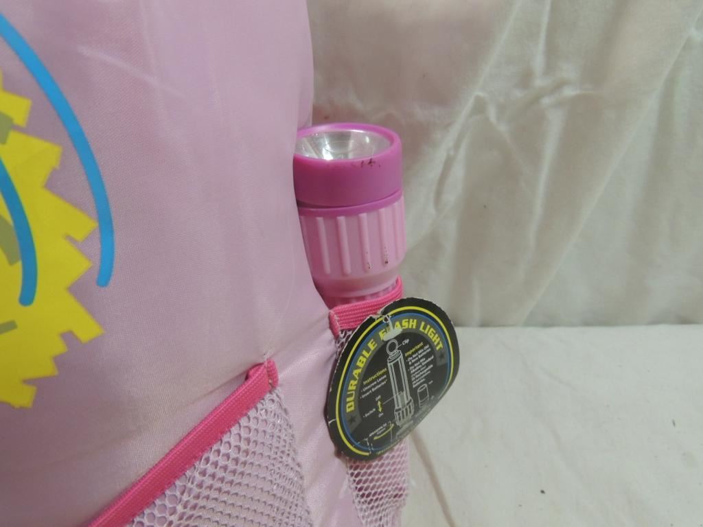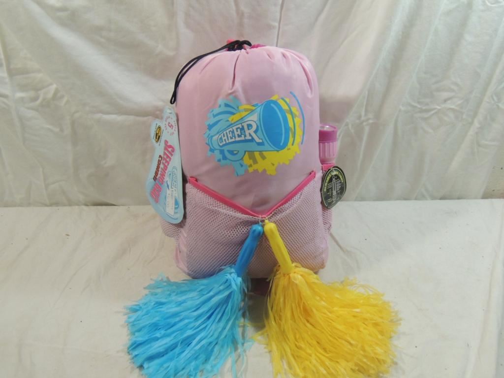 SLEEPING BAG, BACK PACK, DURABLE FLASHLIGHT, DRINK BOTTLE, WHISTLE, POM POMS, AS SHOWN SEE PHOTO FOR MORE DETAILS.