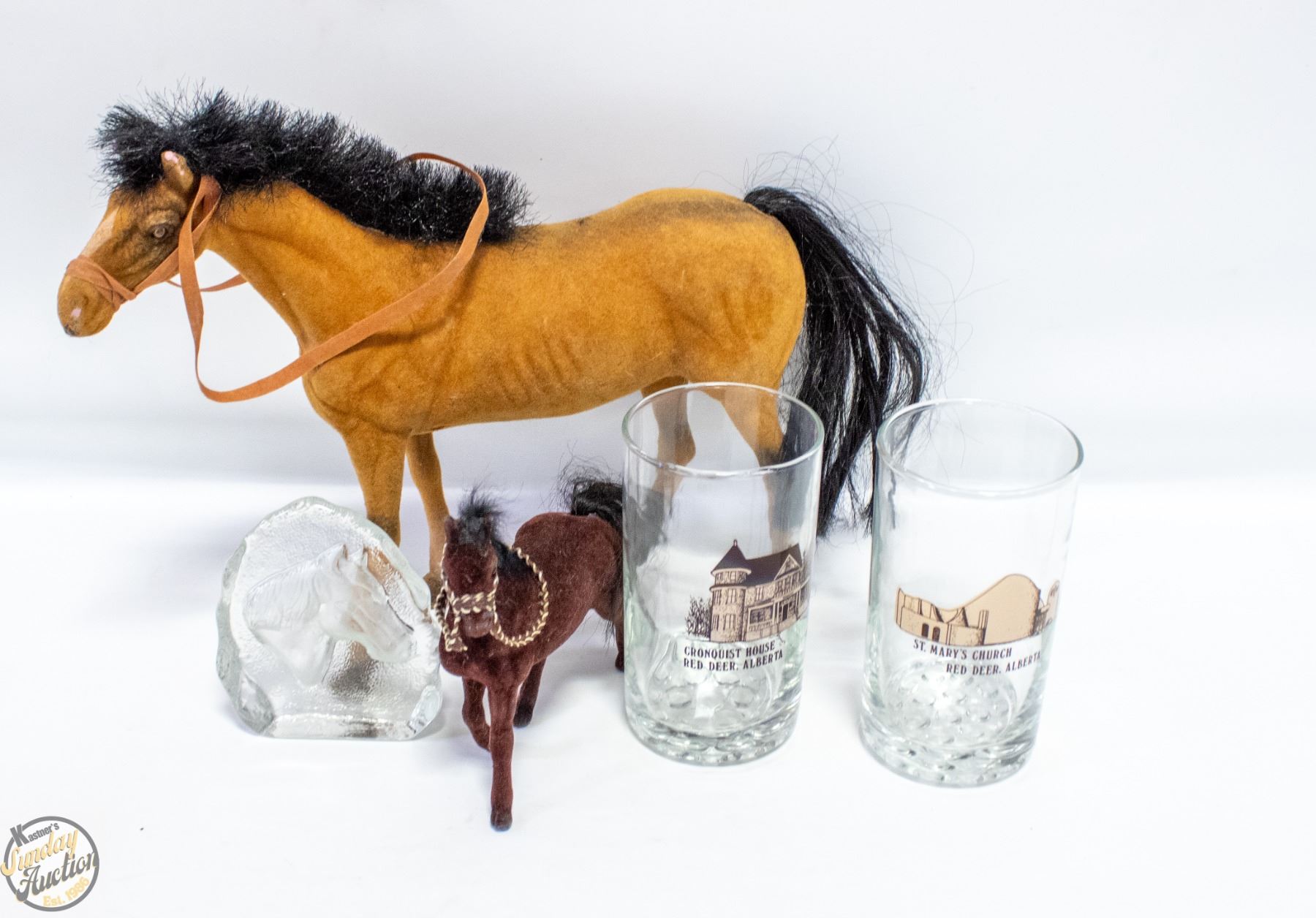 HORSE HEAD MANTEL DECOR + 2 RED DEER DRINKING WARE GLASSES ST MARYS CHURCH + CRONQUIST HOUSE **ALL ITEMS MUST BE REMOVED BY 5PM SATURDAY, MARCH 28TH 2026. ALL REMAINING ITEMS WILL BE SUBJECT TO A $6.00 PER DAY STORAGE CHARGE. ANY ITEMS REMAINING AFTER MONDAY, APRIL 20TH 2026 WILL BE CONSIDERED FORFEITED. NO REFUNDS WILL BE ISSUED FOR FORFEITED ITEMS. TO SCHEDULE A PICK UP APPOINTMENT CLICK HERE