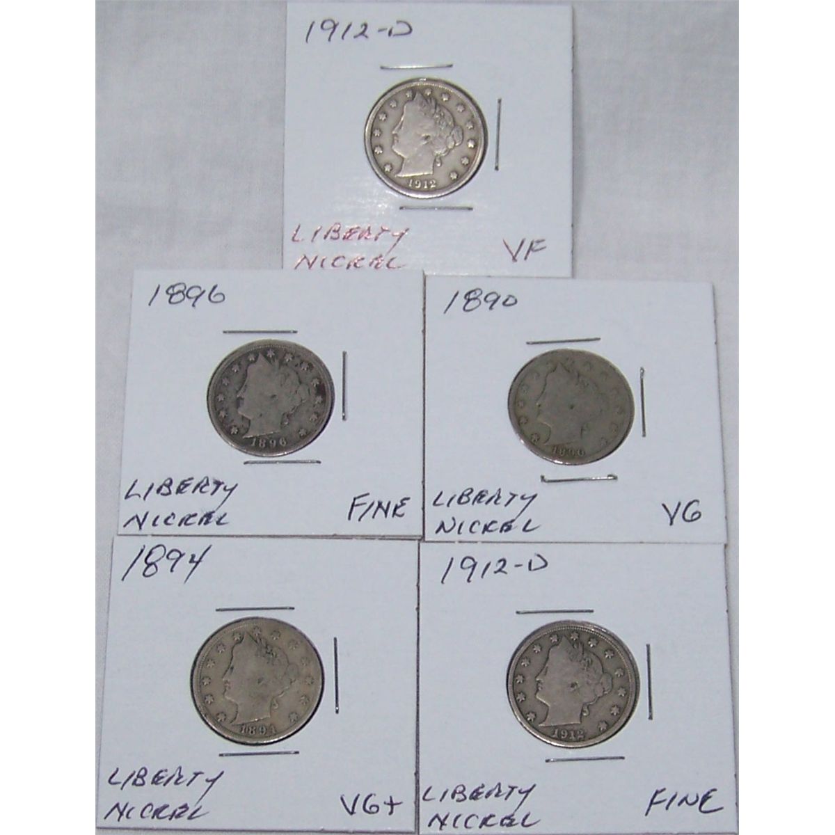 (5X$) CHOICE LIBERTY NICKELS VG-VF 1890,94,96,(2) 1912-D