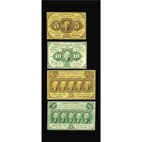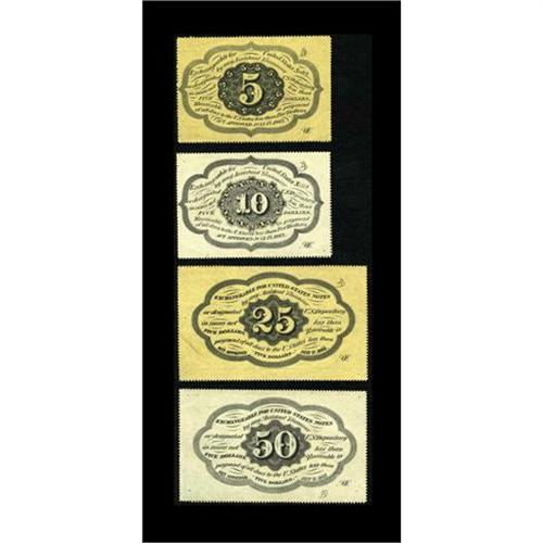 <B>5c - 50c First Issue Perforated 16 Set Choice New.</B></I> This is a very rare complete four note set first brought to the market by Lester Merkin in the 1970's. They are termed Perforated 16 which refers to the number of perforations per 20 millimeters of edge length as compared to the other regular issue notes which have only 12 perforations per 20 millimeters of edge length. No records exist to prove or disprove that this is not a government product but it is not much of a leap of faith to suppose that their origin is from the same source as the Fr. 1310a's. In the O'Mara sale we recently offered the first three denominations of this type and here we have a complete set of four. The notes generally grade Choice New with decent color and crisp paper but there are a couple of tiny pinholes found here and there in each of the notes.