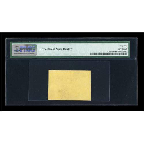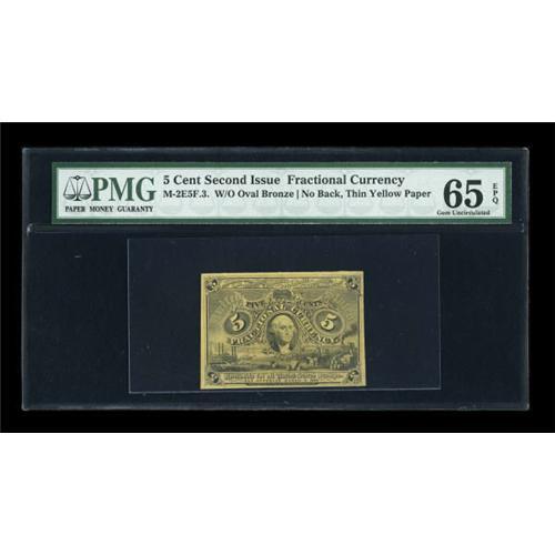 <B>5c Second Issue Experimental Milton 2E5F.3 PMG Gem Uncirculated 65 EPQ.</B></I> PMG has commented "Exceptional Paper Quality" and listed the variety as "W/O Bronze Oval, No Back, Thin Yellow Paper." This is an extremely rare Experimental, particularly without the normal hole cancels. That, combined with the 65 EPQ grade, should attract considerable attention from the ever-increasing ranks of Fractional specialists.<BR><BR><b>Shipping:</b> Coins & Currency (<a target="_blank" href="http://www.heritageauctions.com/common/shipping.php">view shipping information</a>)