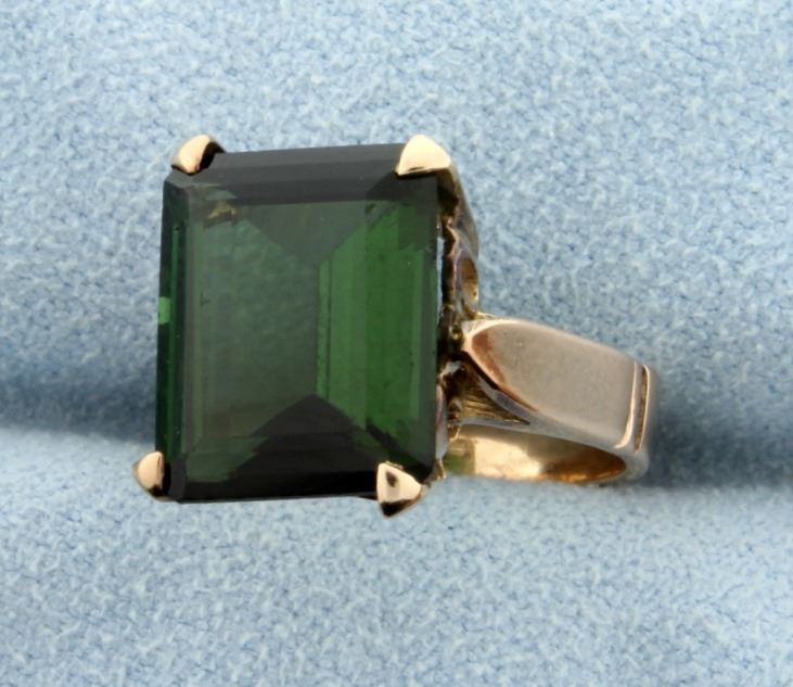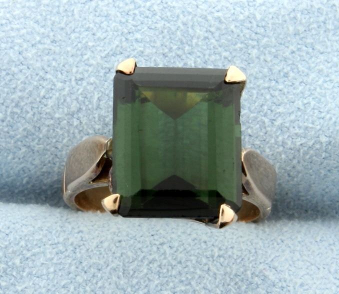 In 14K rose gold, the green tourmaline is 12x10mm emerald cut with deep green color. Size 5 4.6g