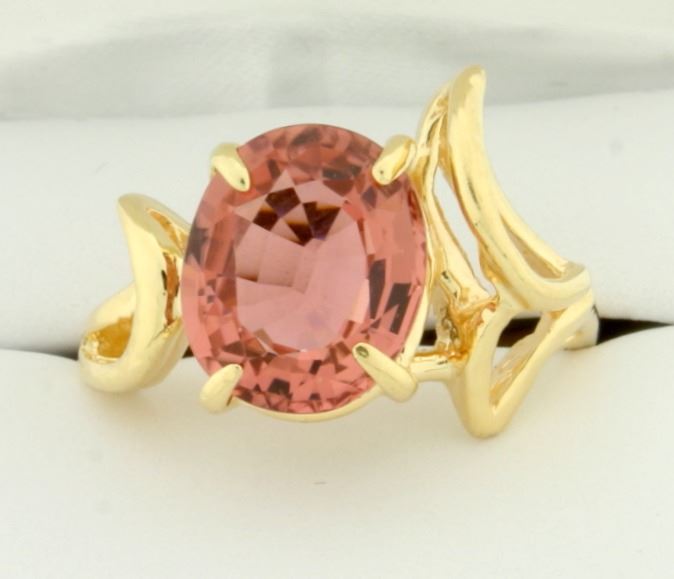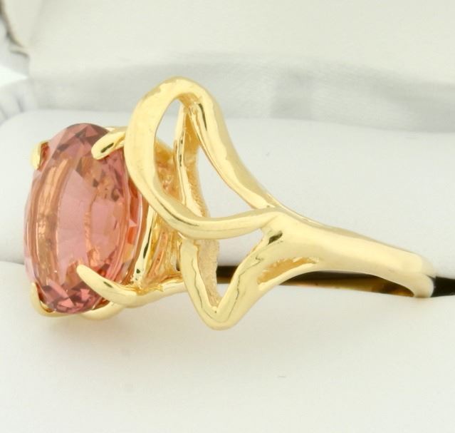 In 14k yellow gold. Contains a 12x10mm Natural Morganite Gemstone with beautiful pink salmon color and excellent clarity. Size 9 1/2. 7.0g.