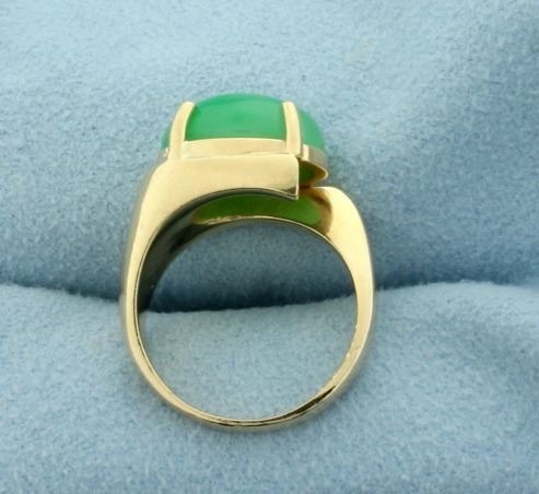 In 14k yellow gold. Contains a high quality natural 13x8.5mm cabochon cut Jade gemstone with uniform bright green color. Size 6 1/2. 7.9g.