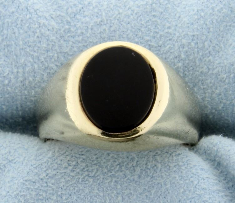 In 14K yellow gold, it contains a 12x10mm onyx gemstone. Size 9 1/4 10.1g