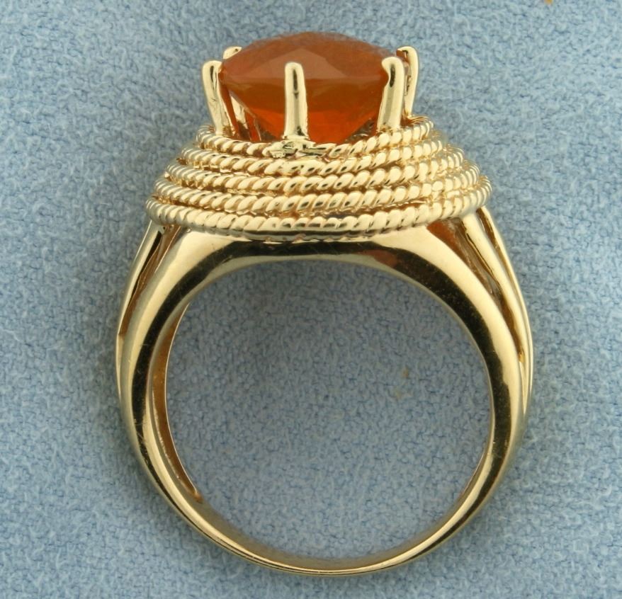 In 14k yellow gold. Contains a natural 5ct spessarite garnet gemstone with a beautiful orange color and checkerboard cut. Size 9 1/4. 7.7g.