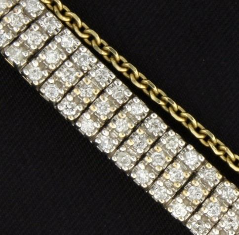 In 10K yellow gold, the bracelet is 7 3/4 inches long and 6.7mm wide, & has a safety chain. It contains 231 high quality round diamonds - SI clarity/H color.          19.5g