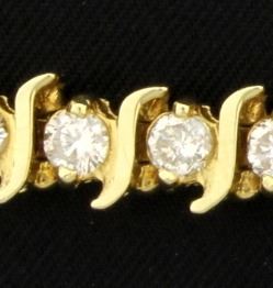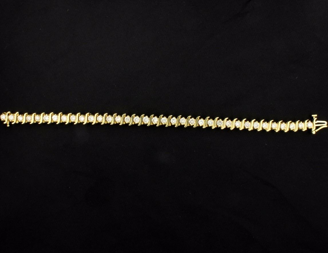 The bracelet is 14K yellow gold and contains 5cts of high quality diamonds, SI clarity/G color. It is 7 inches long with a safety clasp. 15.7g